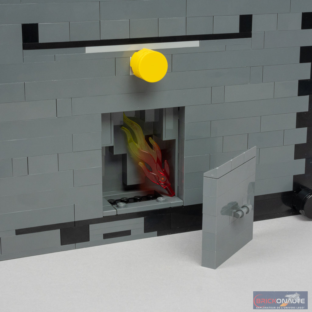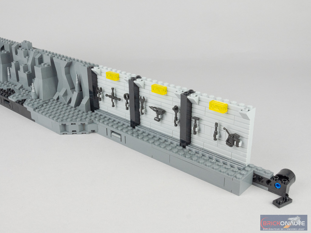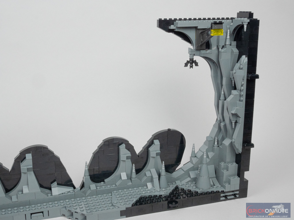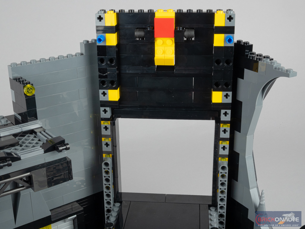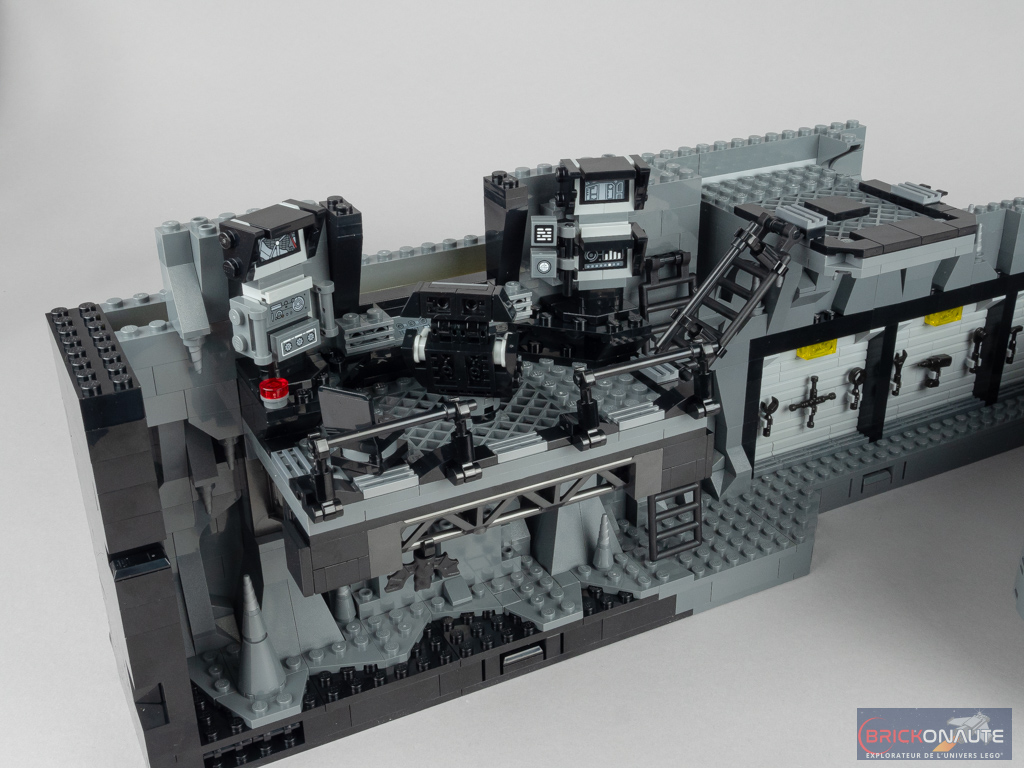 La partie centrale (presque) terminée, on retourne côté Batcave pour terminer d’élever les murs mais surtout pour intégrer les différents mécanismes. Une molette permet ainsi d’ouvrir la porte, retenue par des chaînes, devant la Batsuit. Et une brique lumineuse située juste au-dessus illumine cette tenue, dont seul le masque est visible lorsque la porte est fermée. Un autre mécanisme permet d’ouvrir les portes coulissantes révélant l’attirail du Chevalier Noir, avec un grappin et 4 batarangs. Les petits compartiments en partie basse sont malheureusement vides – j’aurais aimé y trouver quelques accessoires supplémentaires.