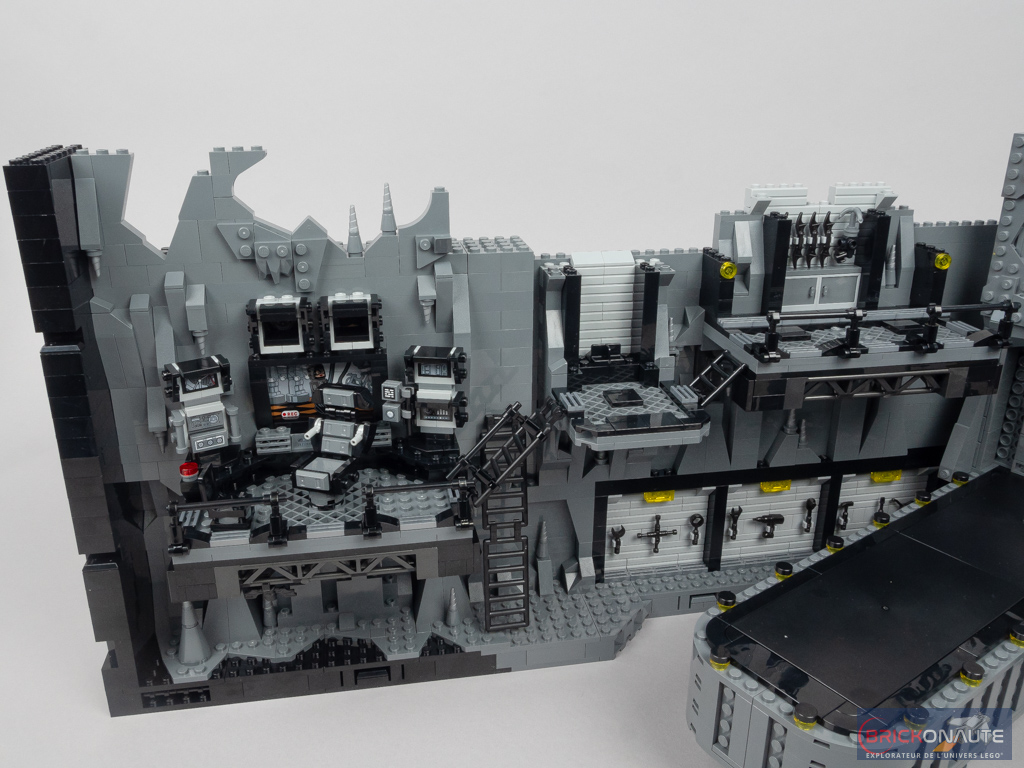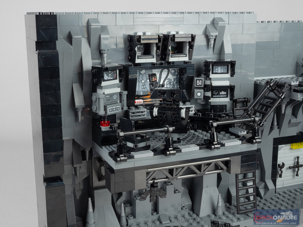 Les étapes suivantes voient la construction des différentes plateformes de la Batcave, conçues de la même manière : une structure fixée sur des éléments SNOT, qui reçoit ensuite les différents équipements / mécanismes. La plateforme la plus intéressante, et celle par laquelle on commence, propose la construction du Bat-ordinateur. La finition est irréprochable, même si j’aurais préféré que LEGO s’abstienne d’utiliser autant d’autocollants : aucun des écran n’est tampographié, pas même les petites tiles 1×1 et encore moins la grande tile 8×16 qui permet d’afficher le contenu des 3 écrans centraux.