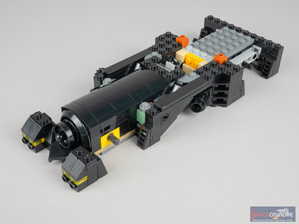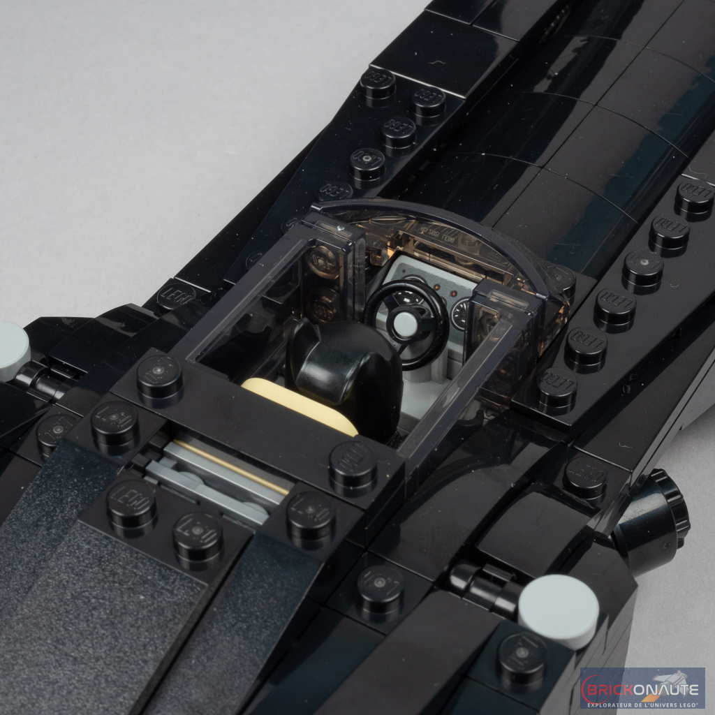 Je préfère la technique employée ici pour réaliser les « ailes » arrières, fixées sur des clips et prenant un angle plus cohérent avec l’engin vu dans le film. Les entrées d’air latérales sont également traitées différemment et pour le coup, je préfère la version du set 76224 plutôt que ces éléments ronds qui semblent trop petits. J’aurais également aimé que LEGO apporte plus de soin aux jantes – un petit logo du Chevalier Noir n’aurait pas été de refus ! Pour le reste, le design semble réussi et cohérent pour une reproduction à cette échelle.
