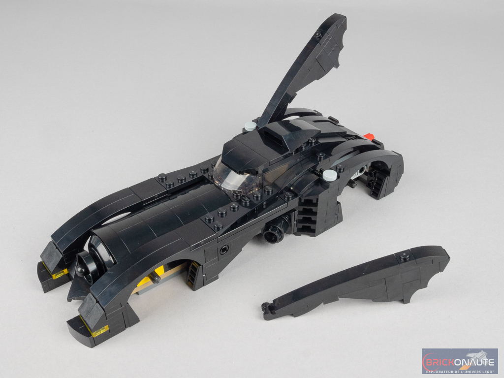 La construction commence par la Batmobile à l’échelle minifig, similaire à celle sortie au mois d’août dernier sous la référence LEGO Batman 76224 Batmobile: Batman vs. The Joker Chase (438 pièces – 47,99 €) – mon test à cette adresse. Similaire seulement au premier regard, les détails étant bien différents.