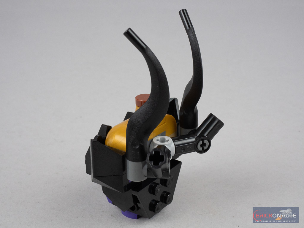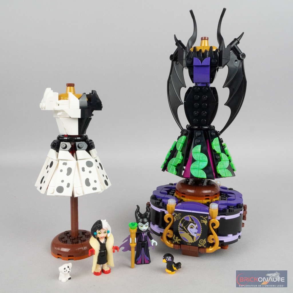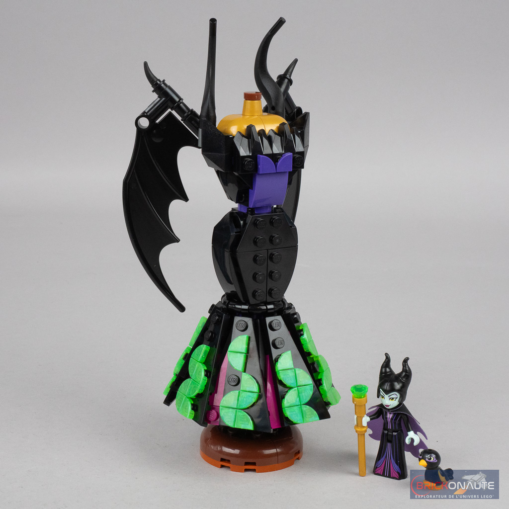 La construction est assez similaire pour les deux robes avec un support avec quelques connecteurs Technic, une couronne sur laquelle on clipse 8 sous-ensembles pour former le volant, puis un sous-assemblage du buste qu’on attache ensuite au reste de la construction. Petite subtilité pour la robe de Maléfique, le volant se situe au niveau des genoux et on assemble donc, avant le buste, un autre sous-ensemble au niveau des hanches. Cette robe arbore également deux sous-ensembles sur l’arrière, fixés sur des connecteurs Technic, avec deux grandes ailes de dragon.