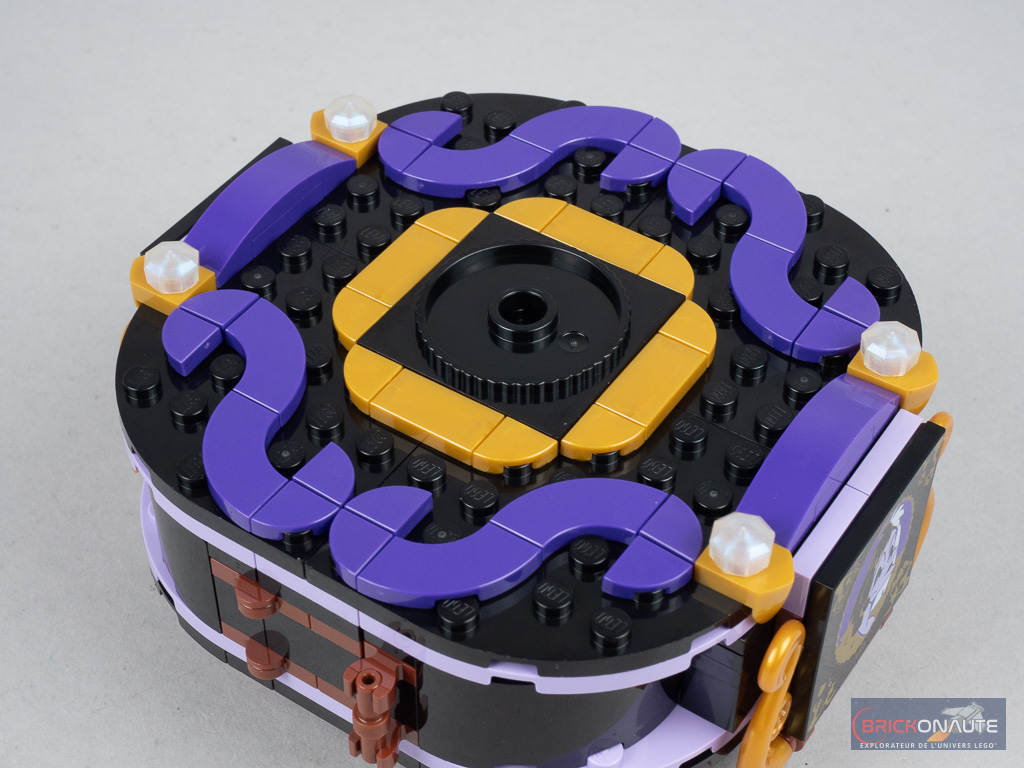 Le support est plutôt joli et sert de « boîte » pour ranger les deux minidolls. Mais vous l’aurez compris, il faudra donc choisir l’une des deux robes pour la fixer sur la turntable centrale prévue à cet effet. On tournera alors ce support dans le bon sens pour afficher le portrait de la méchante en question. Dommage : je trouve que cela « déséquilibre » le set et j’aurais préféré un support adapté, plus large et pouvant donc accueillir les deux robes. D’autant que si ces robes devenaient une « collection » récurrente chez LEGO, il aurait fallu faire un choix : un support pour toutes les robes, ou pas de support du tout – et un prix plus raisonnable.