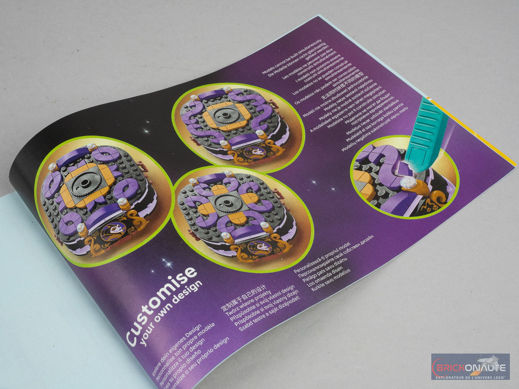La construction du support d’exposition est assez simple également avec un sous-ensemble central sur lequel on en fixe deux autres sur des charnières – chacun d’eux arborant le portrait d’une des deux méchantes. On forme ainsi une « boîte » dans laquelle on pourra ranger les deux minidolls. Notez que LEGO inclut dans la notice quelques « inspirations » si vous souhaitez personnaliser le motif présent sur le support.