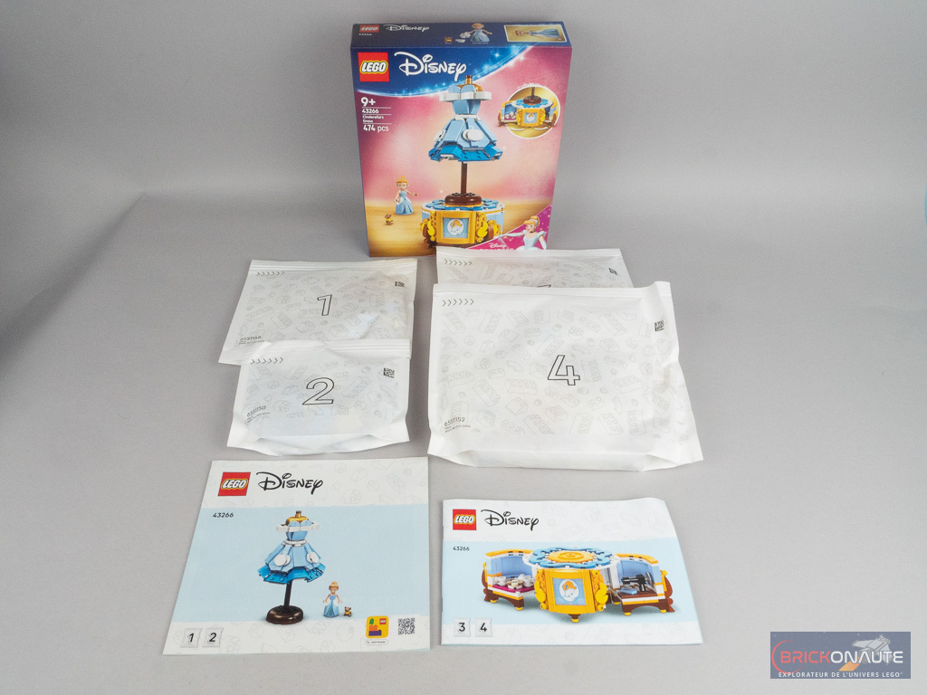 Dans la petite boîte aux couleurs des princesses Disney, on trouve 4 sachets de pièces (en papier) numérotés, et 2 notices d’instructions. Les 2 premiers sachets de pièces et la première notice serviront à la construction de la robe, les suivants à celle du présentoir. L’inventaire est plutôt généreux pour un set sous licence avec 474 pièces pour 39,99 €, soit 0,084 €/pièce. Il n’y a pas le moindre autocollant et tous les éléments décorés sont tampographiés, soit le joli portrait de Cendrillon du socle et 4 tiles 1×3.