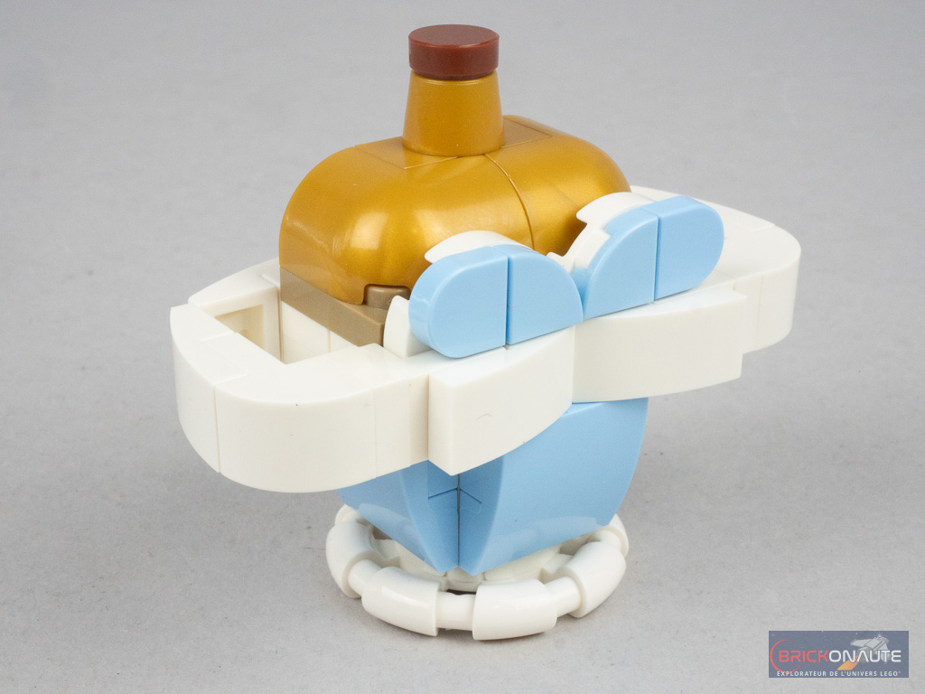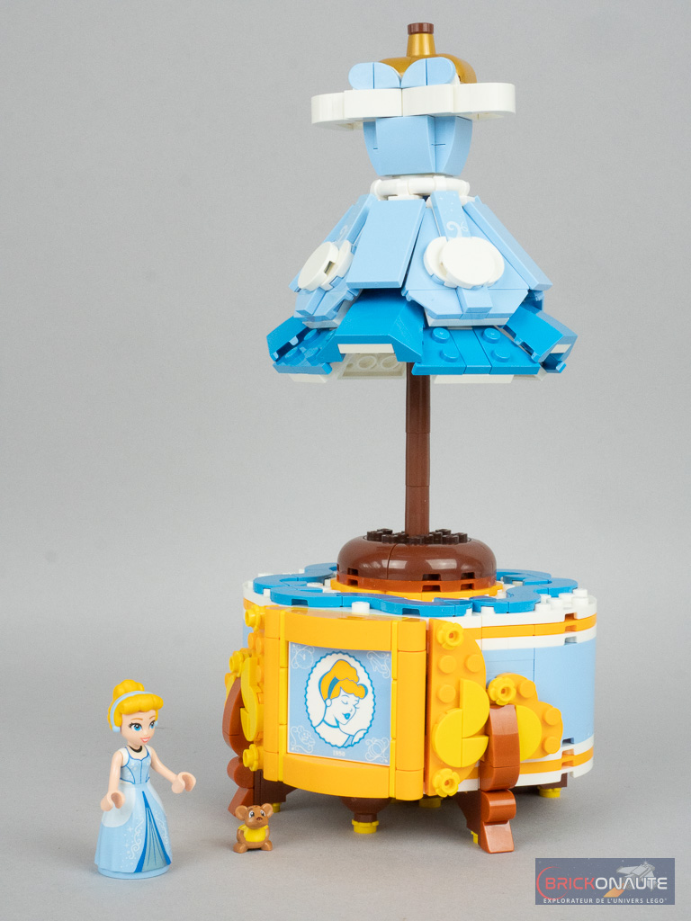 La robe est accompagnée d’une unique minidoll de Cendrillon dans sa robe de bal – donc sans articulation au niveau des hanches. Si le torse a déjà été vu dans plusieurs références, le bas de la robe est inédit et la tampographie très jolie, même si le blanc sur les côtés est un peu terne. La coiffure avec le serre-tête est également très réussie et conforme au personnage du dessin animé. Elle est d’ailleurs plutôt rare, puisqu’elle n’est apparue que dans deux autres sets. Cendrillon est accompagnée de la souris Gus, déjà vue dans d’autres références LEGO.
