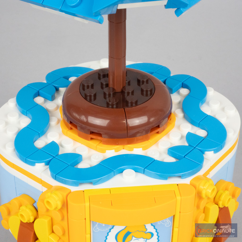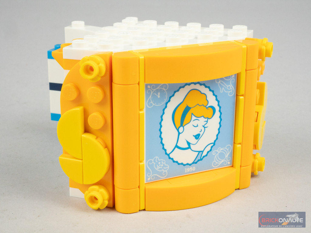 Mais ce n’est pas tout ! Car si la robe est indéniablement réussie, c’est également le cas du socle d’exposition avec un joli mélange light royal blue / flame yellowish orange rappelant la robe de Cendrillon et sa couleur de cheveux. Il est très élégamment décoré, avec un tile tampographiée du portrait de Cendrillon (avec la date du film, 1950, en dessous) et LEGO fournit une collection de tiles pour agrémenter la partie supérieure. Remarquez aussi le niveau de détail des pieds.