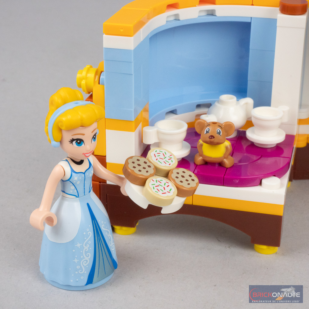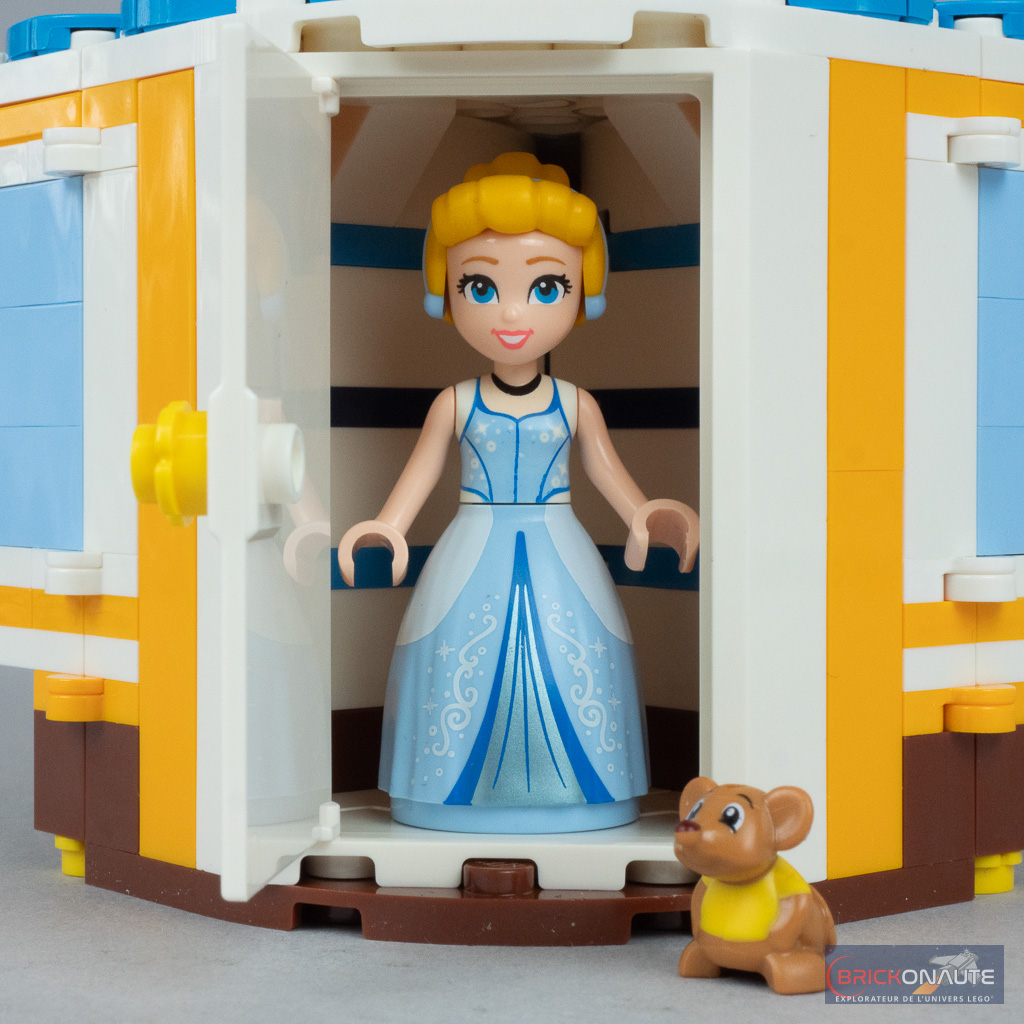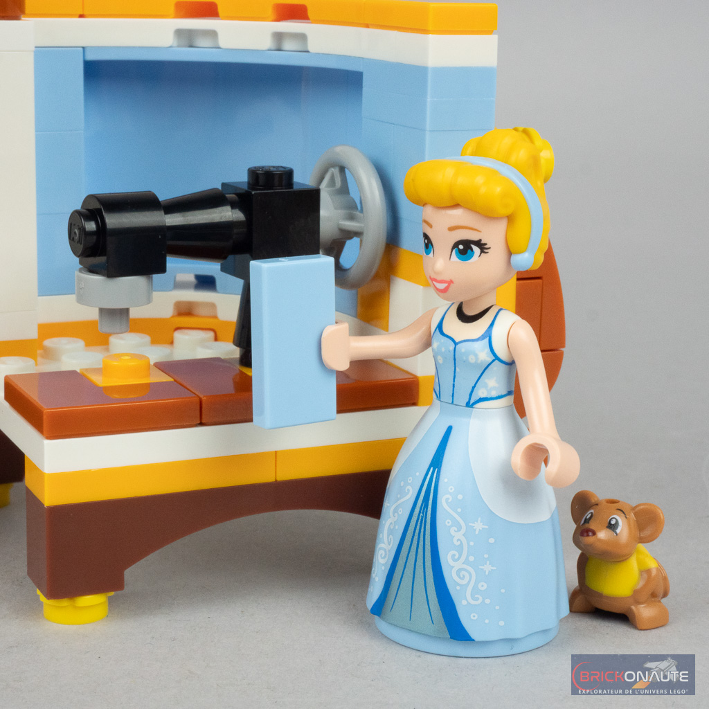 En ouvrant le support sur les côtés, on découvre deux petites scènes inspirées du film d’animation avec une machine à coudre d’un côté, et un petit salon de thé avec quelques gourmandises de l’autre. Si ce n’est pas la vocation première de ce set, leur présence offre un peu de jouabilité à l’ensemble et c’est toujours bon à prendre. À l’arrière du support, une petite porte dévoile un logement dans lequel ranger la minidoll de Cendrillon et la souris Gus si on le souhaite. C’est donc un support d’exposition nettement plus travaillé et ambitieux que celui du set 43262 Maleficent’s and Cruella De Vil’s Dresses qui nous est proposé ici.