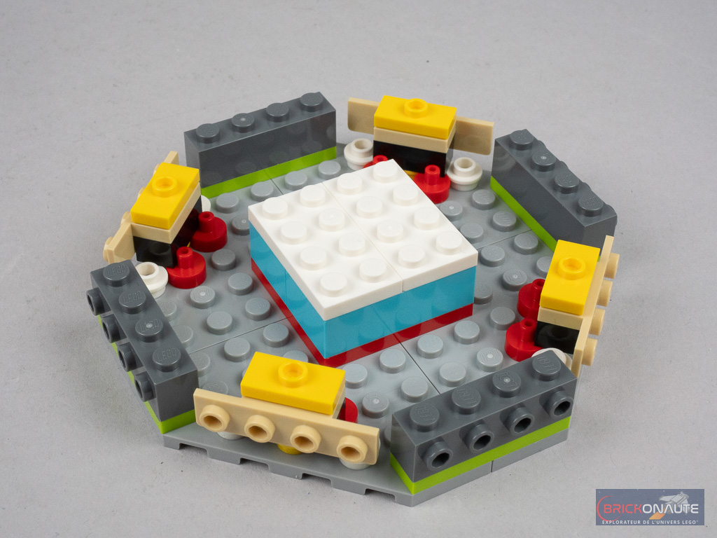 Les ailes sont attachées sur des ball joints (gris…) et les éléments de la queue sur des charnières à cliquet (grises…). La tête propose une structure SNOT, avec également deux charnières pour y fixer les gros yeux globuleux de Heihei selon l’angle adéquat. L’assemblage se termine avec le socle dont la structure renferme un assemblage intéressant permettant d’obtenir ce qui ressemblerait presque à un cercle. Il ne reste qu’à attacher Heihei à ce socle, et la construction est terminée.