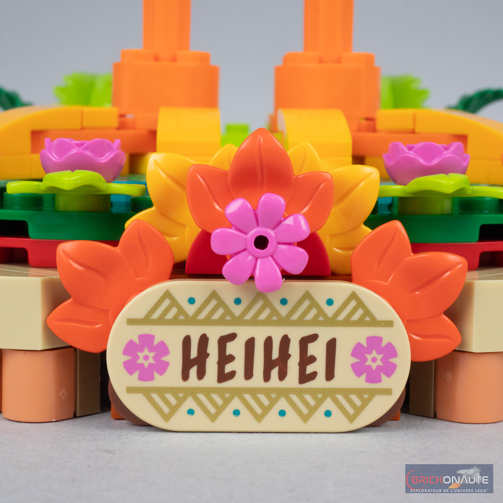 L’inventaire est plutôt généreux pour un produit sous licence, avec 566 pièces et un prix public de 39,99 € – soit 0,071 €/pièce – l’absence de minidoll / minifig et le grand nombre de petits éléments expliquant probablement ce ratio. On trouve quelques pièces intéressantes dans l’inventaire dont ce qui me semble être un nouveau moule, pour le bec : une slope jaune « surélevée ». On remarquera aussi des pièces dans des couleurs inédites jusqu’ici et notamment une jolie variété d’éléments reddish orange, une couleur relativement récente et encore plutôt rare au catalogue LEGO. Dernier détail important, il n’y a pas d’autocollants : la tile avec le nom de Heihei est bien tampographiée.