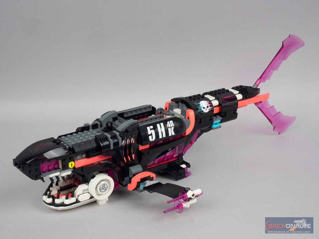 Au rang des autres fonctionnalités on notera la possibilité d’ouvrir la vigie pour y installer une minifig aux commandes, de retirer ladite vigie pour mettre un autre personnage dans le « ventre » du requin – il sera alors visible au travers des panels roses, ou de personnaliser l’ensemble en réorganisant les modules, qui sont clipsés au corps du requin.