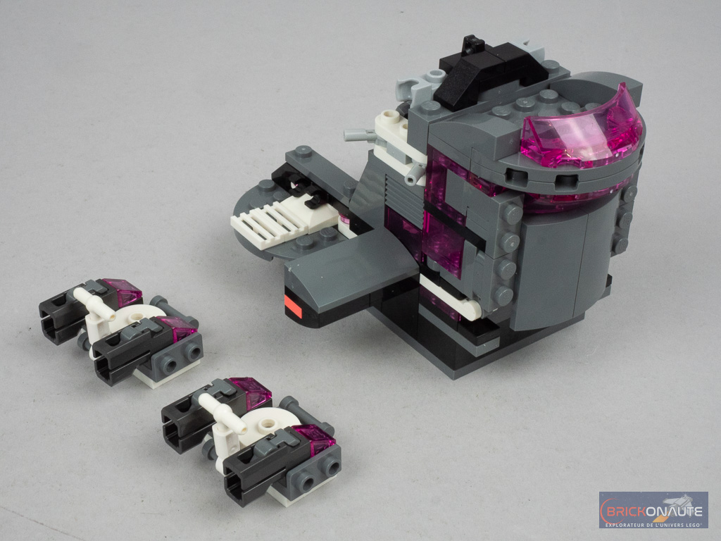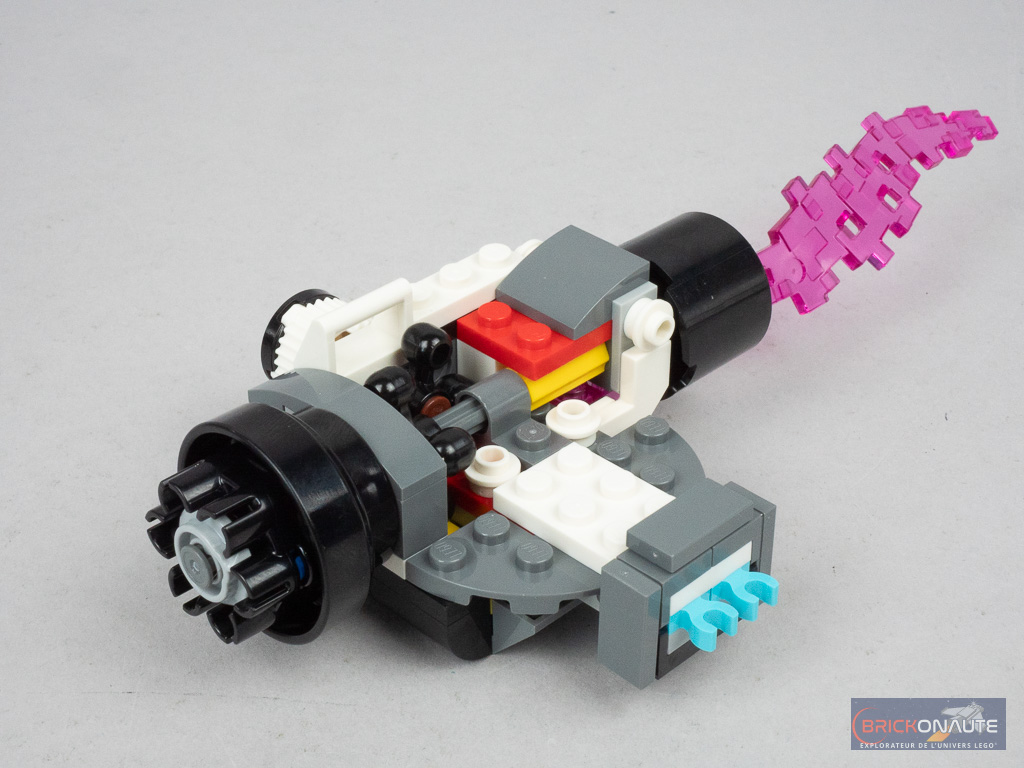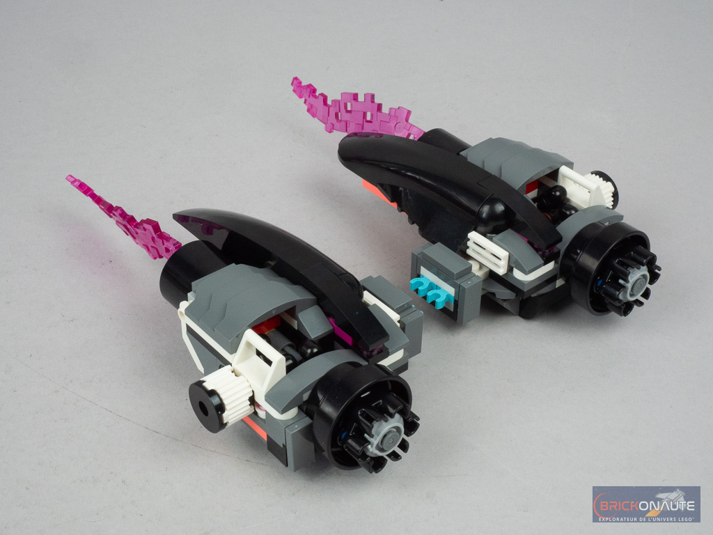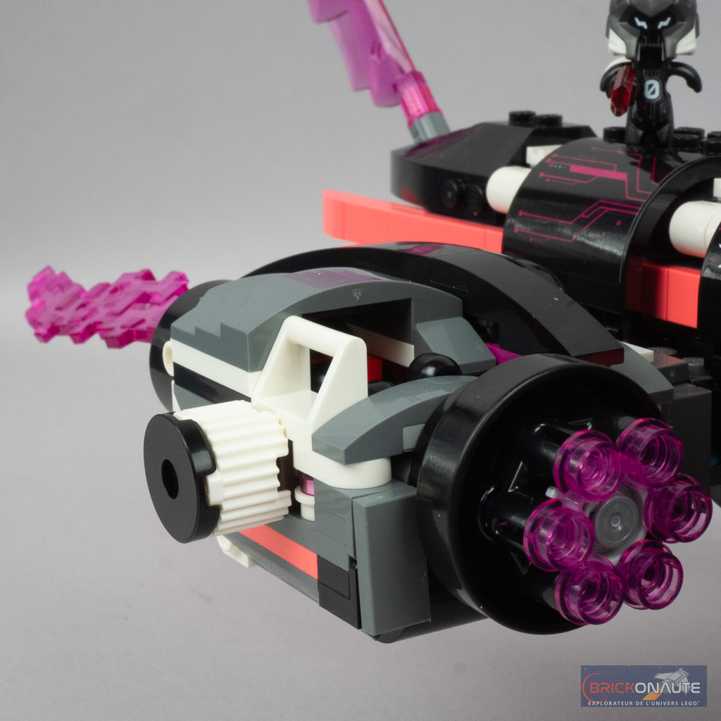 Ce qu’on ne pourra en revanche pas retirer à cette boîte, c’est sa jouabilité maximale. À commencer par toutes les choses qui permettent de se tirer dessus : des spring shooters déclenchés en ouvrant la bouche du requin (avec un mécanisme plutôt bien fichu, d’ailleurs), des mitrailleuses activées par une molette (qui fait aussi tourner la « flamme » rose située derrière), ou les deux micro-vaisseaux prévus les cybervilains qui disposent chacun de deux stud shooters. LEGO fournit d’ailleurs une cargaison de petites round plates en vrac, certaines ne manqueront sans doute pas de s’égarer au gré des combats.