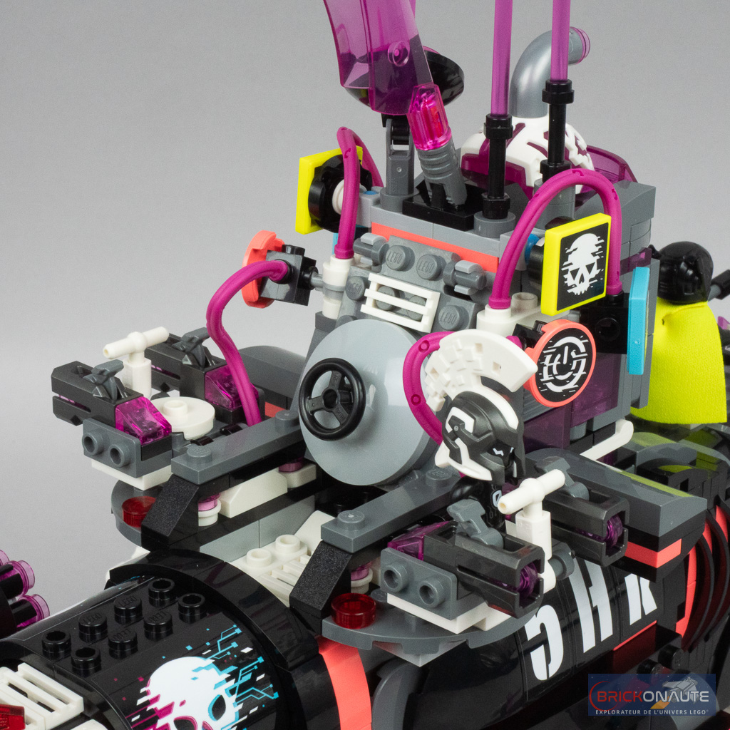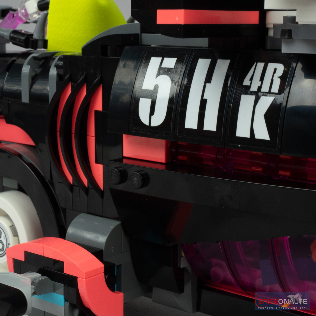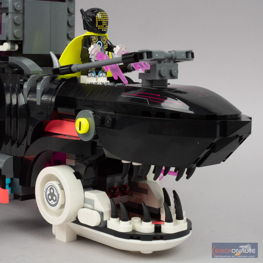 Ce qu’on ne pourra en revanche pas retirer à cette boîte, c’est sa jouabilité maximale. À commencer par toutes les choses qui permettent de se tirer dessus : des spring shooters déclenchés en ouvrant la bouche du requin (avec un mécanisme plutôt bien fichu, d’ailleurs), des mitrailleuses activées par une molette (qui fait aussi tourner la « flamme » rose située derrière), ou les deux micro-vaisseaux prévus les cybervilains qui disposent chacun de deux stud shooters. LEGO fournit d’ailleurs une cargaison de petites round plates en vrac, certaines ne manqueront sans doute pas de s’égarer au gré des combats.