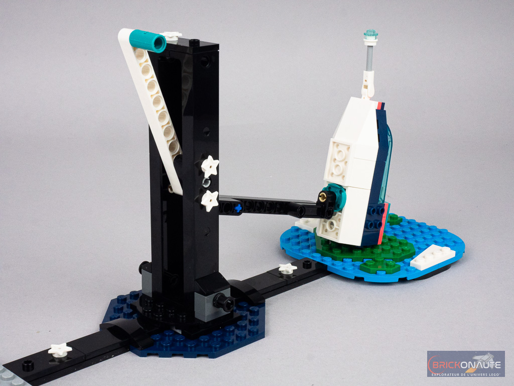 Le problème à résoudre, c’est que celui-ci est déséquilibré. L’expérience va donc consister à déplacer son centre de gravité et à le surélever, pour pouvoir le faire alunir en toute sécurité. La solution est assez simple à mettre en oeuvre, et les pièces fournies permettent d’imaginer quelques variantes.