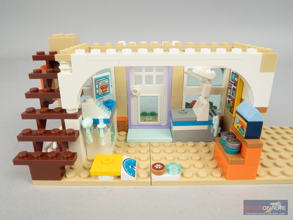 La construction est assez classique pour ce type de bâtiments ouverts sur l’arrière. Sur une base de couleur tan, on élève les murs et les diverses ouvertures tout en aménageant le rez-de-chaussée avec de nombreux accessoires pour la clinique vétérinaire. Le niveau supérieur est assemblé à part puis rapporté sur la construction principale, les deux pans de toiture obliques sont attachés par des clips à la structure. Pour retrouver toutes les photos de la construction, je vous invite à consulter la galerie de photos complète à cette adresse.