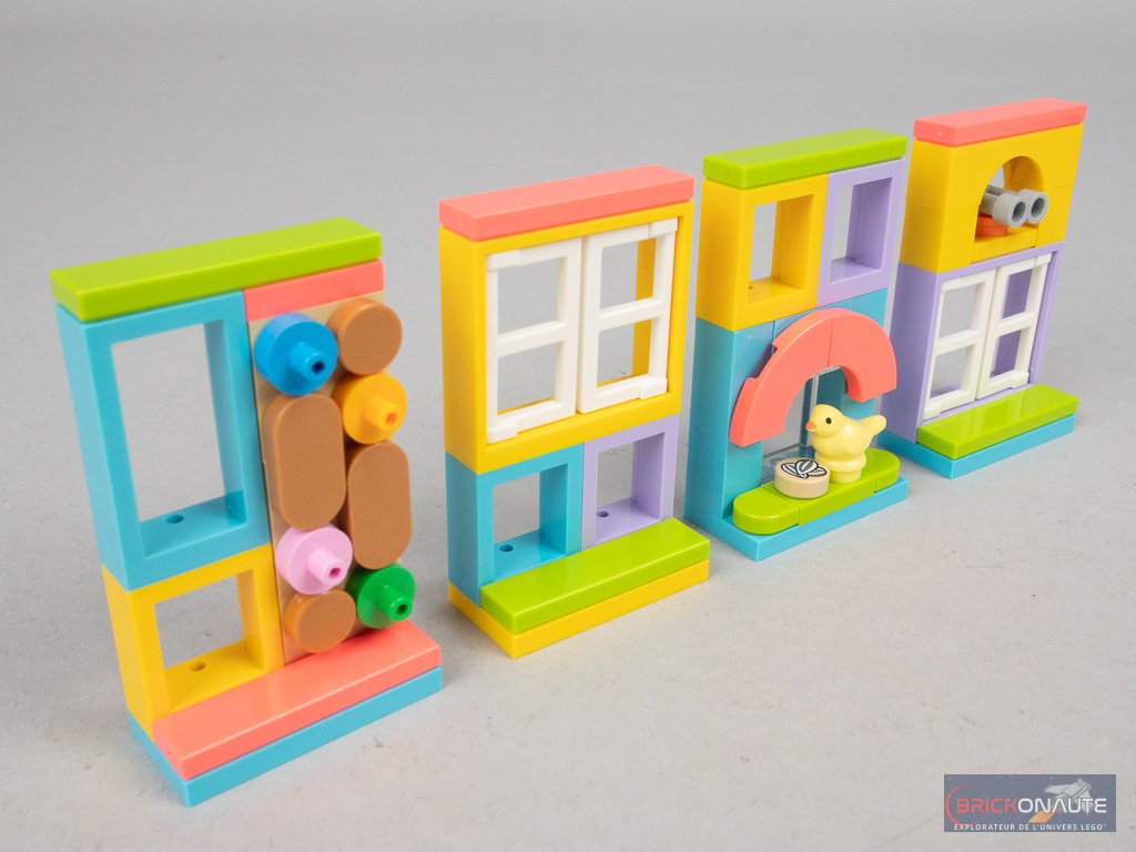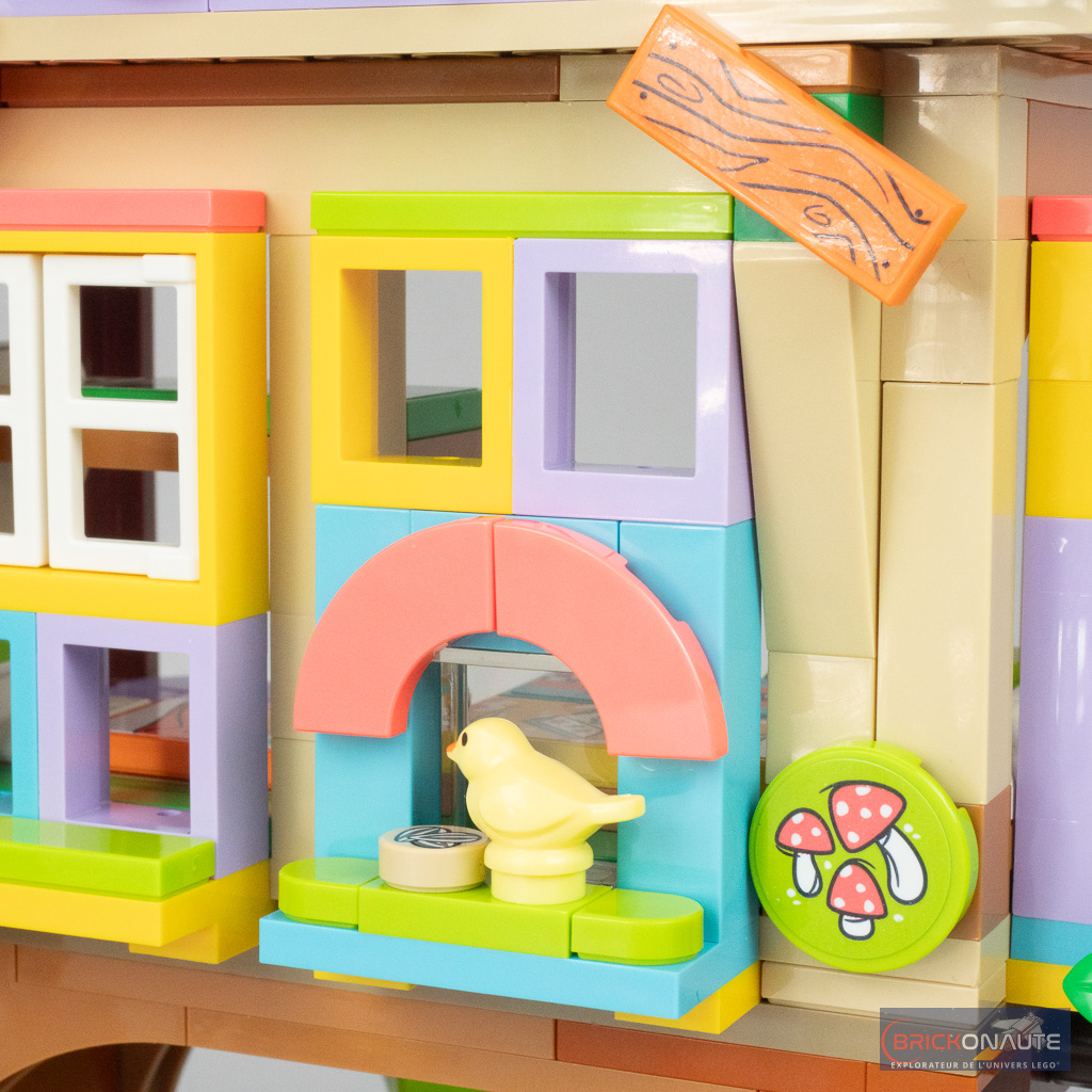 Pour le reste, l’assemblage s’organise par « modules ». Après avoir assemblé le petit établi et la base de l’arbre, on construit une à une les différentes pièces qui composent cette cabane avec une chambre, une petite cuisine et une jolie terrasse – puis on les positionne sur la structure. L’assemblage se termine par la « façade » extérieure avec, entre autres, des cadres de fenêtres colorés, puis par quelques branches d’arbres qui viennent se fixer sur les connecteurs laissés en attente.