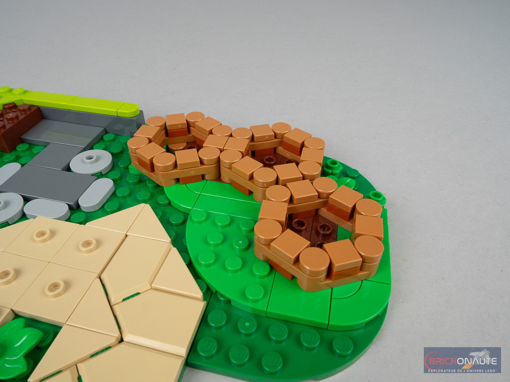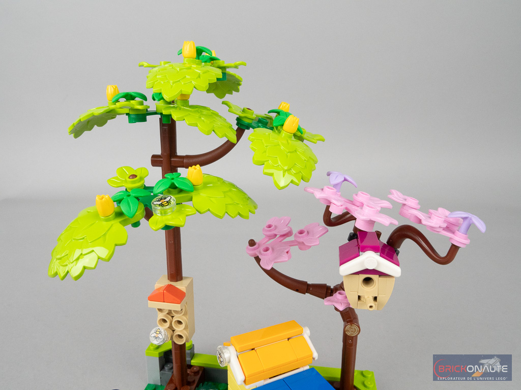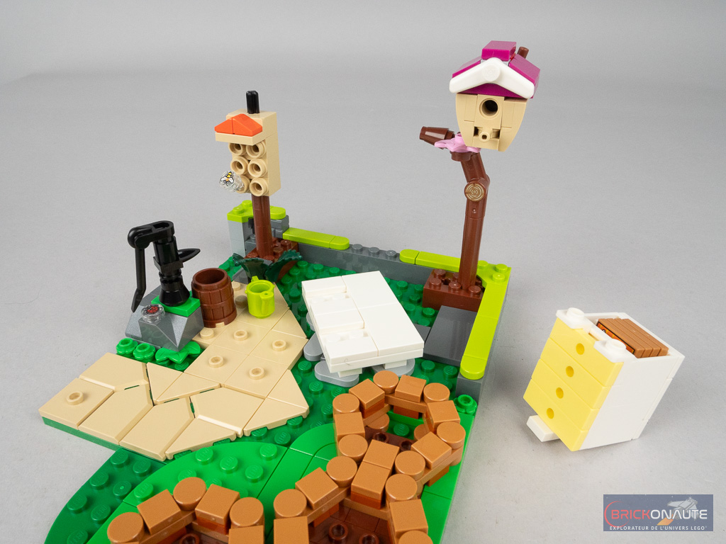 La pompe à eau est assez simple dans sa conception mais fait un bel usage du pied de biche qui se transforme en levier. Enfin, la conception des deux arbres est assez traditionnelle, on remarquera surtout le joli nichoir. Malheureusement et comme souvent chez LEGO, les arbres sont un peu rachitiques.