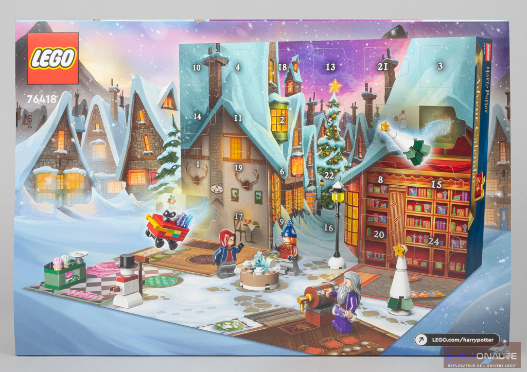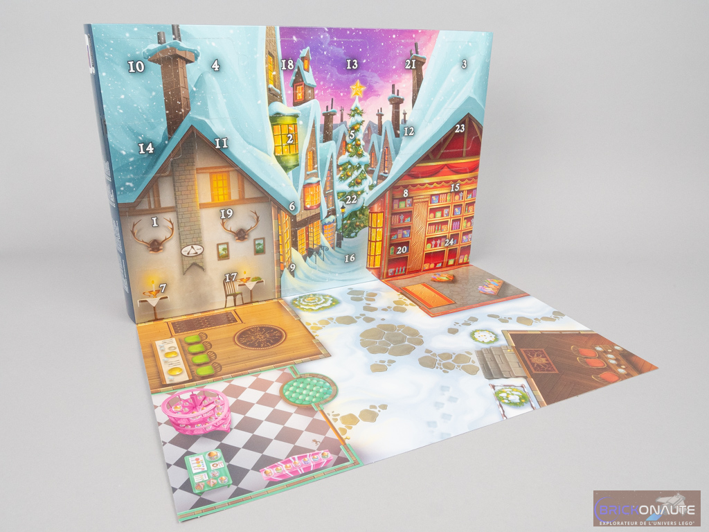 La boîte est, comme d’habitude, plutôt jolie avec cette année les rues de Pré-au-Lard enneigées. En détachant le volet à l’arrière de la boîte, on découvre les 24 cases numérotées et l’intérieur de l’auberge des Trois Balais, de celle de la Tête de Sanglier, du magasin de farces et attrapes Zonko et du magasin de bonbons Honeydukes. On peut également ouvrir le côté de la boîte comme un set classique et découvrir un « tiroir » de 24 cases en carton, contenant autant de sachets.