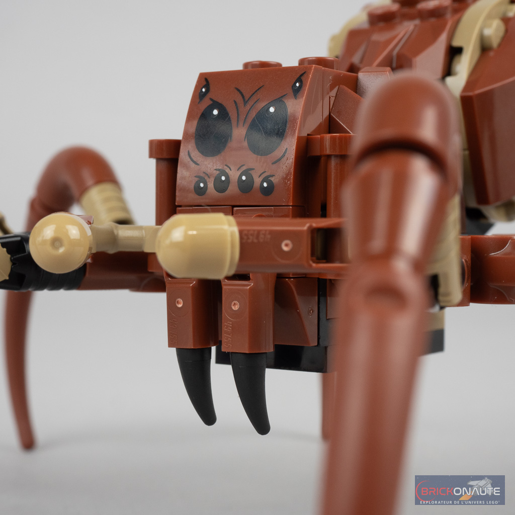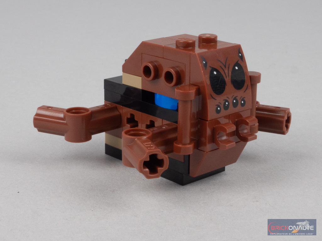 La petite boîte contient 3 sachets en papier numérotés, et une notice d’instructions de 44 pages. L’inventaire compte 195 pièces, on y remarquera surtout une jolie variété d’éléments reddish brown dont quelques pièces inédites : 4 « coques » pour le corps de la bestiole, et une slope tampographiée avec ses 8 yeux.
