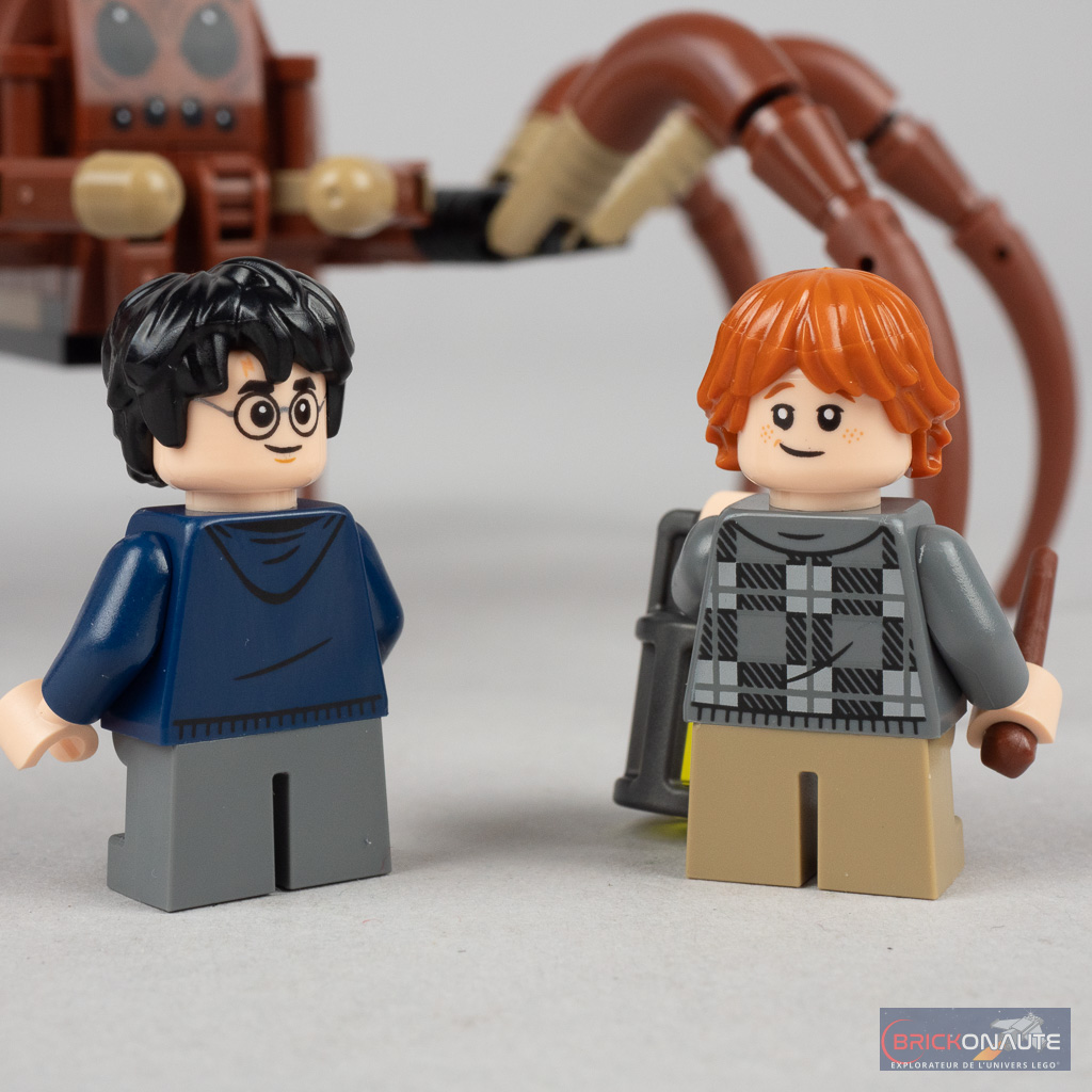 On retrouve logiquement 2 minifigs dans cette boîte avec Ron Weasley et Harry Potter, tous les deux proposés dans une tenue inédite, détaillées et fidèles à celles qu’ils portent à cet instant du film. Leurs visages et leurs coiffures sont en revanche beaucoup plus courants et déjà vus dans de nombreux sets de la gamme.