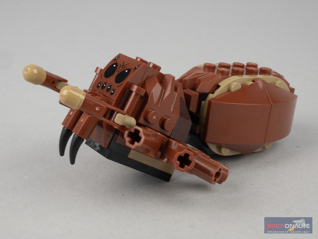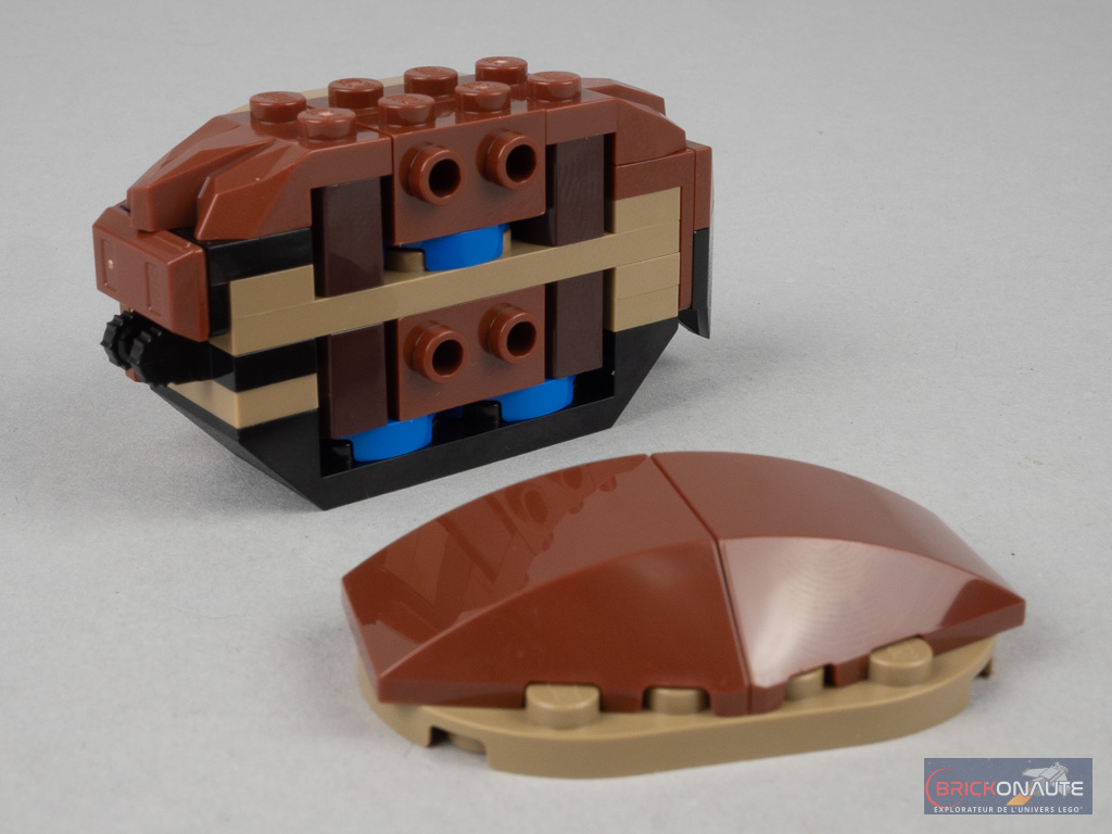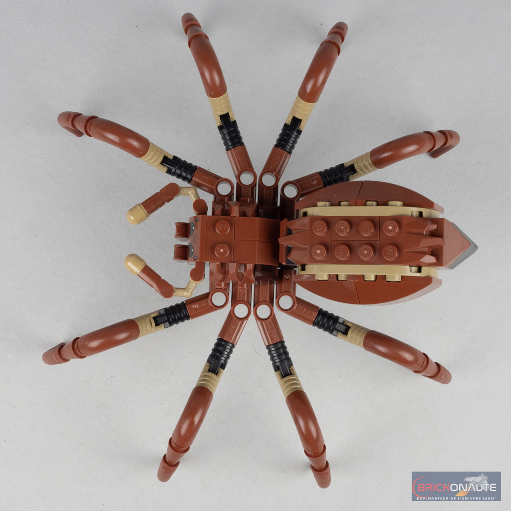 La petite boîte contient 3 sachets en papier numérotés, et une notice d’instructions de 44 pages. L’inventaire compte 195 pièces, on y remarquera surtout une jolie variété d’éléments reddish brown dont quelques pièces inédites : 4 « coques » pour le corps de la bestiole, et une slope tampographiée avec ses 8 yeux.