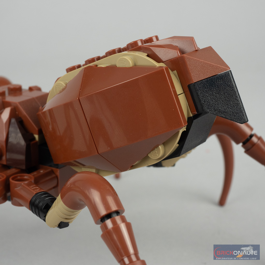 Pour Aragog, la construction se décompose en 3 étapes distinctes. On commence par le céphalothorax qui renferme des briques prévues pour y insérer des axes Technic, ainsi que les mandibules. On continue avec l’abdomen, réalisé sur la base d’une structure SNOT avant d’y attacher les deux parois latérales puis de l’accrocher au corps sur une charnière à cliquet. On termine avec les 8 pattes, toutes identiques, réalisées à base de connecteurs divers et variés.