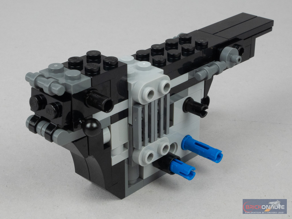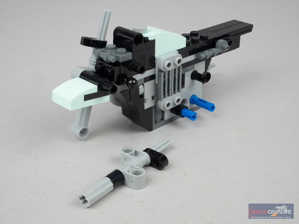 On commence par la construction de la moto, simple mais efficace : une structure centrale décorée de quelques éléments SNOT, des axes Technic pour les roues, et quelques clips pour les éléments de décoration supplémentaires comme les rétroviseurs. L’angle de la fourche est intelligemment trouvé : elle est fixée sur des pins, bloqués en position par des éléments saillants. Des pins Technic dépassent sur le côté pour la fixation du side-car.