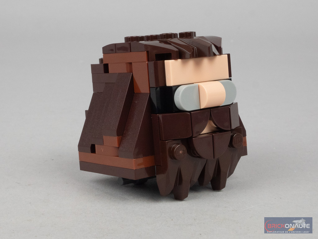 La tête renferme, à la manière des BrickHeadz, une brique rose. Quelques grandes slopes et d’autres « griffes » forment la chevelure et la barbe, les lunettes que portent Hagrid à cet instant du film sont représentées par de petites tiles grises. On la fixe sur des clips, de sorte qu’elle est légèrement mobile, de bas en haut. On termine avec les mollets et les pieds, fixes, puis on attache Hagrid à la moto.