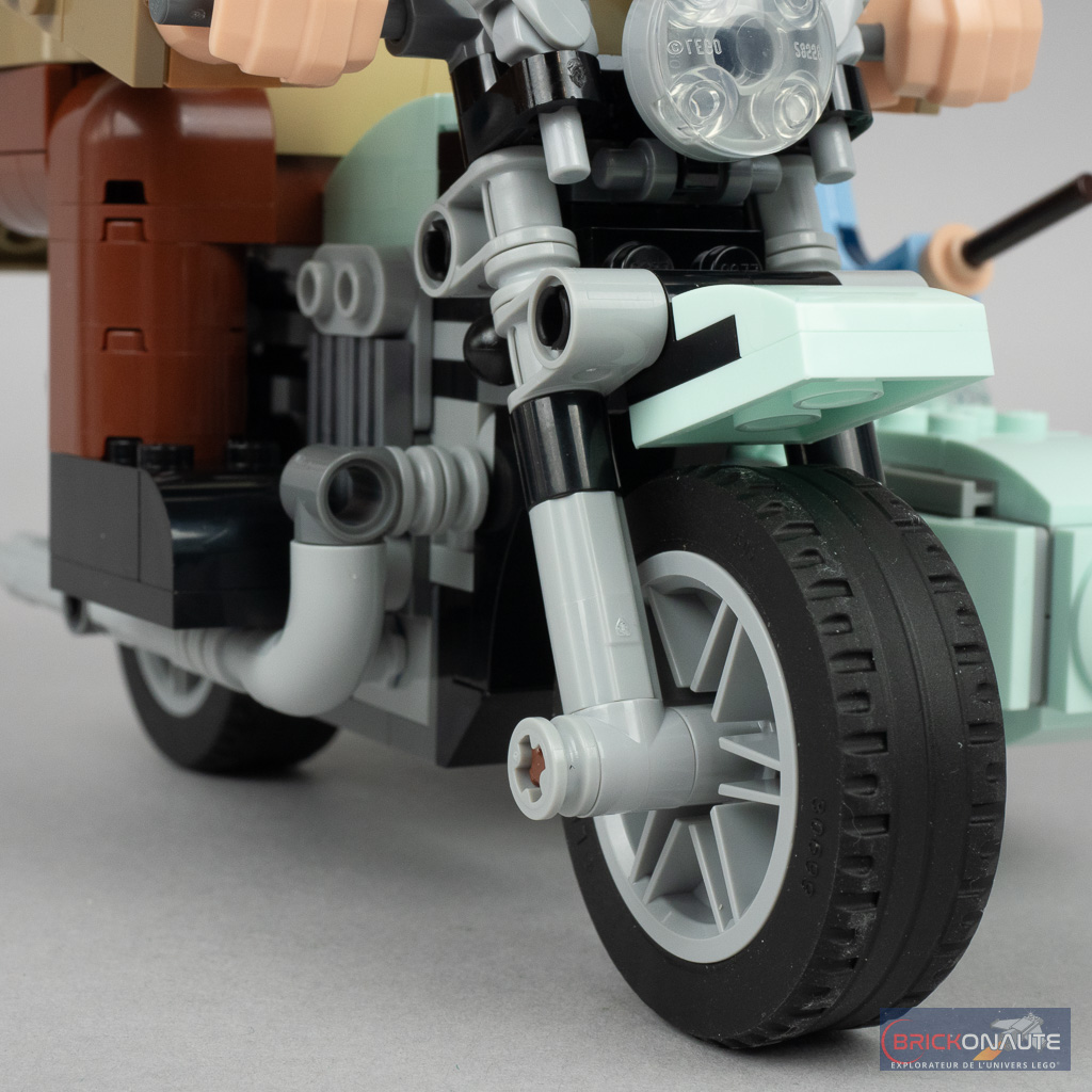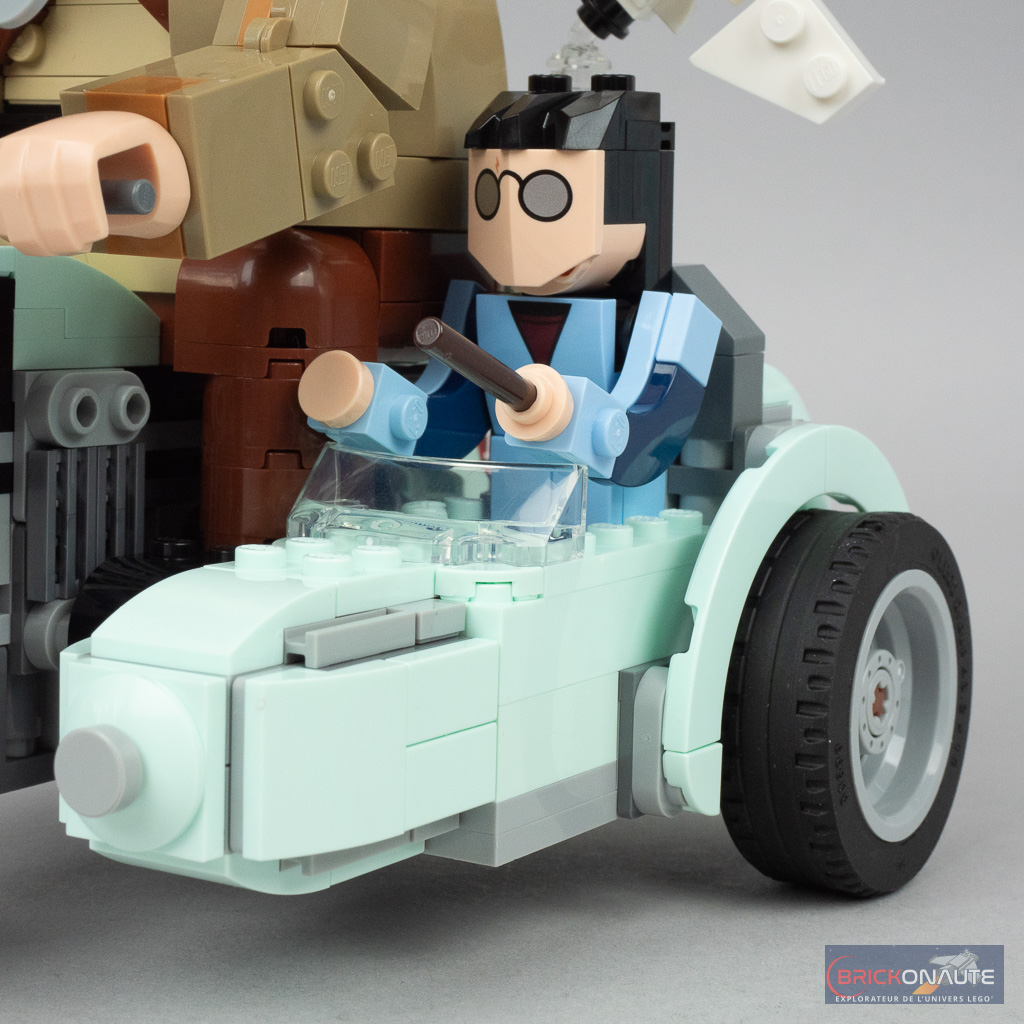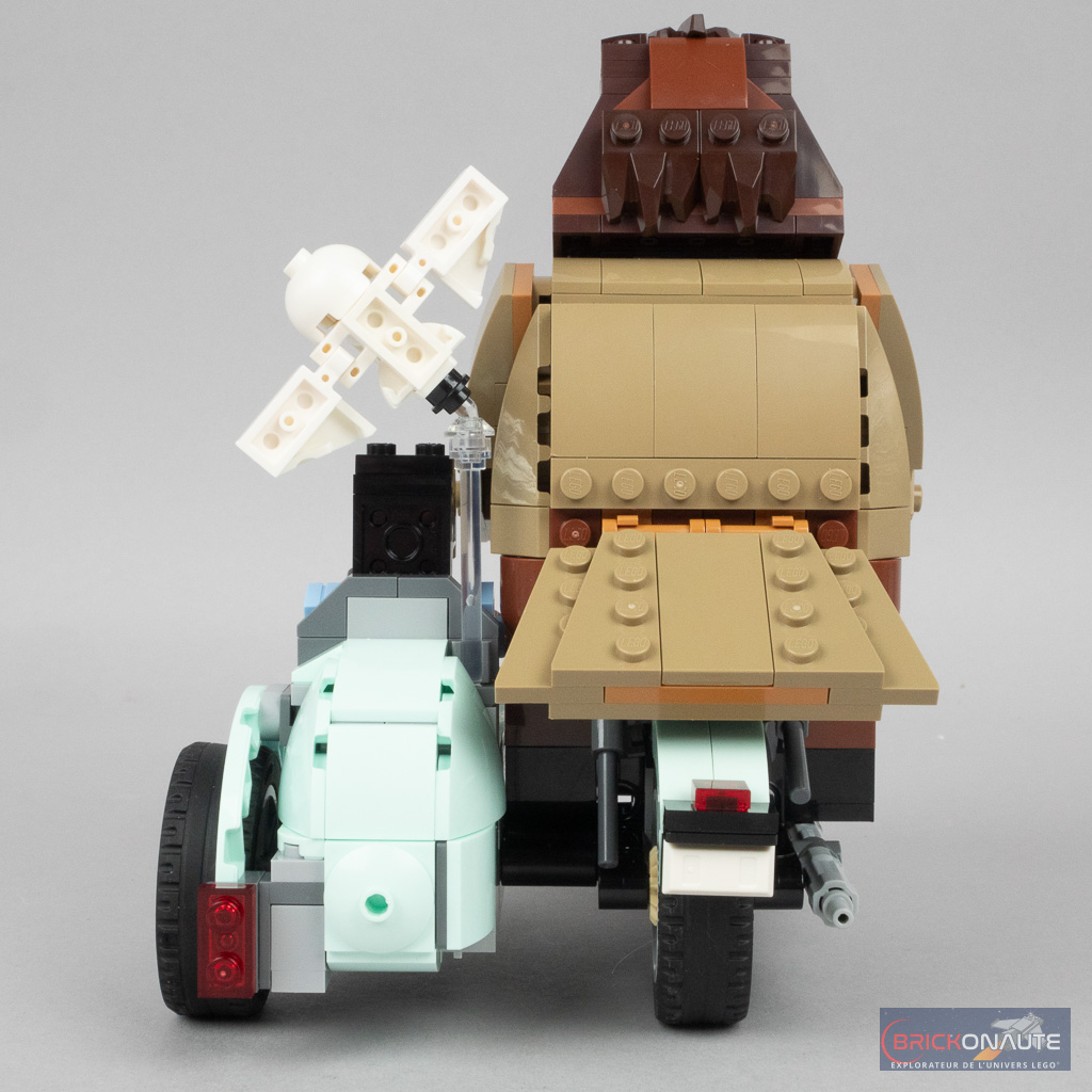 Le moins que l’on puisse dire c’est que ce set est « particulier ». Plutôt que de proposer une mise en scène habituelle basée sur des minifigs qui aurait nécessité une simplification extrême de la moto, tout en l’accompagnant, pourquoi pas, d’un ciel étoilé ou d’un morceau de ville microscale, LEGO nous propose une version brick built des personnages qui permet par ailleurs une meilleure représentation de la différence de taille entre ces derniers. L’impression de cet énorme personnage sur une moto qui semble bien trop petite pour lui est plutôt bien retranscrite.
