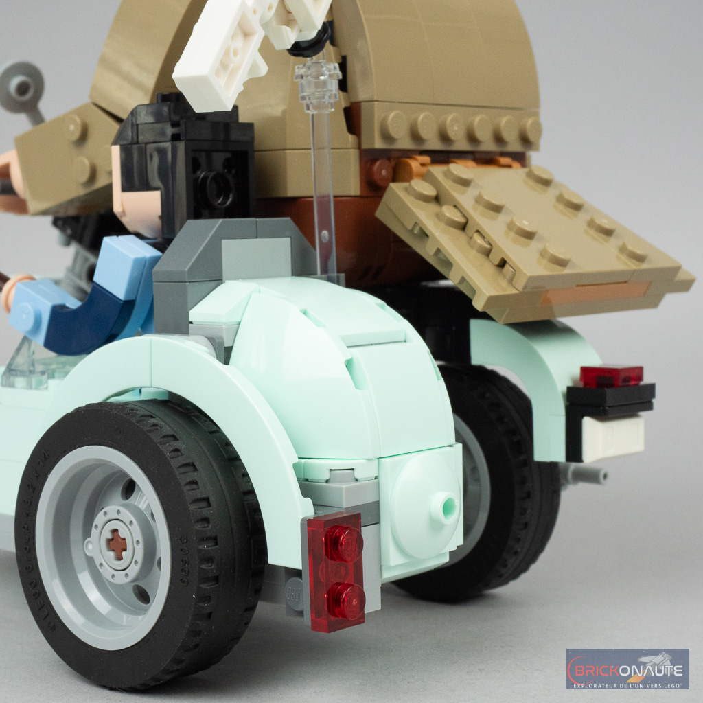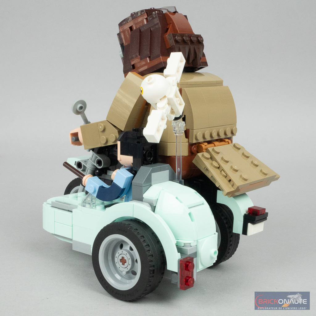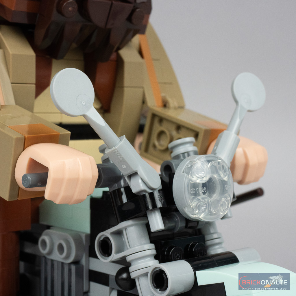 Le moins que l’on puisse dire c’est que ce set est « particulier ». Plutôt que de proposer une mise en scène habituelle basée sur des minifigs qui aurait nécessité une simplification extrême de la moto, tout en l’accompagnant, pourquoi pas, d’un ciel étoilé ou d’un morceau de ville microscale, LEGO nous propose une version brick built des personnages qui permet par ailleurs une meilleure représentation de la différence de taille entre ces derniers. L’impression de cet énorme personnage sur une moto qui semble bien trop petite pour lui est plutôt bien retranscrite.