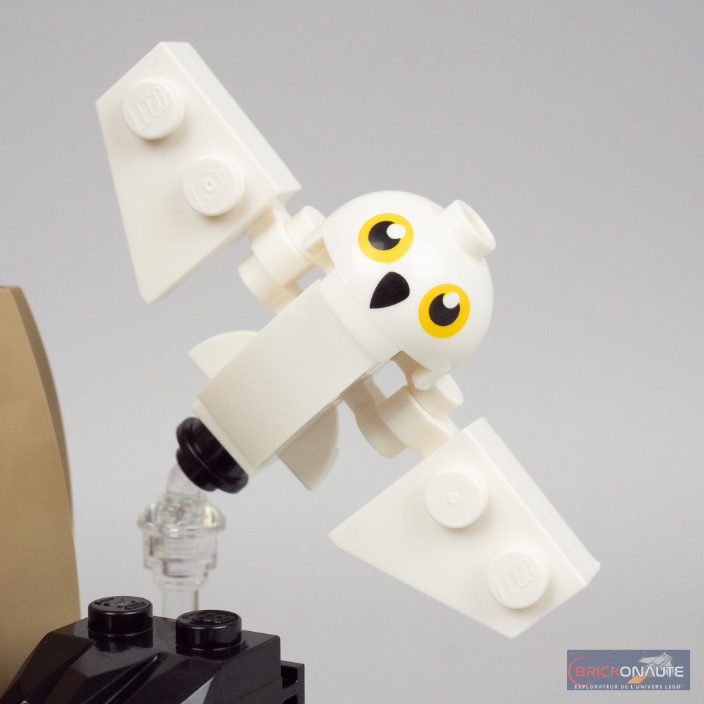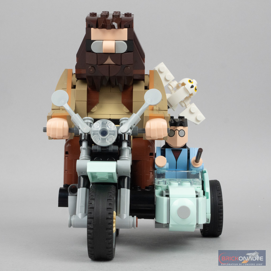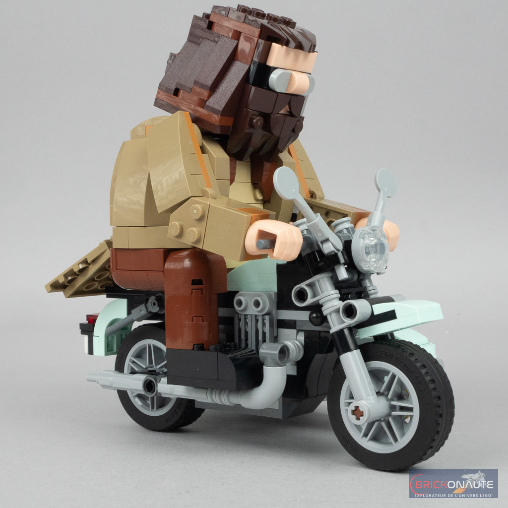 Les degrés de mobilité sont assez restreints. On pourra ajuster légèrement la position de la tête d’Hagrid et lui faire bouger les bras / les poignets – concernant Harry on pourra seulement ajuster légèrement les bras. Les ailes d’Hedwige, articulées sur des clips, sont ajustables tout comme la position de la chouette elle-même. Pas de fonctionnalités particulières si ce n’est que les roues… tournent, comme vanté sur la page du produit sur le Shop LEGO : Les roues de la moto tournent pour que les enfants puissent rejouer des scènes culte de Harry Potter.