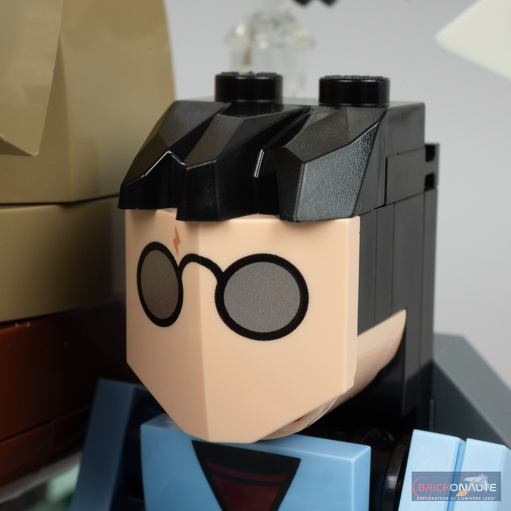 En termes de proportions, je trouve également qu’Hagrid est bien reproduit avec un niveau de détail tout à fait satisfaisant, particulièrement pour la tête, qui rend le personnage instantanément reconnaissable. Je suis plus réservé pour Harry avec cette pièce un peu étrange utilisée pour la tête, sans nez ni bouche, mais il était probablement difficile de trouver, à cette échelle, une solution brick built convenable. L’avantage d’utiliser une pièce tampographiée permet tout de même de retranscrire deux des principales caractéristiques du personnage : ses lunettes rondes, et sa cicatrice en forme d’éclair sur le front.