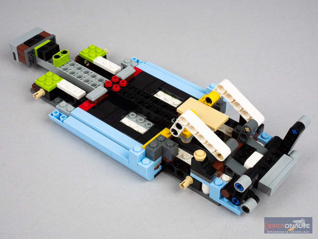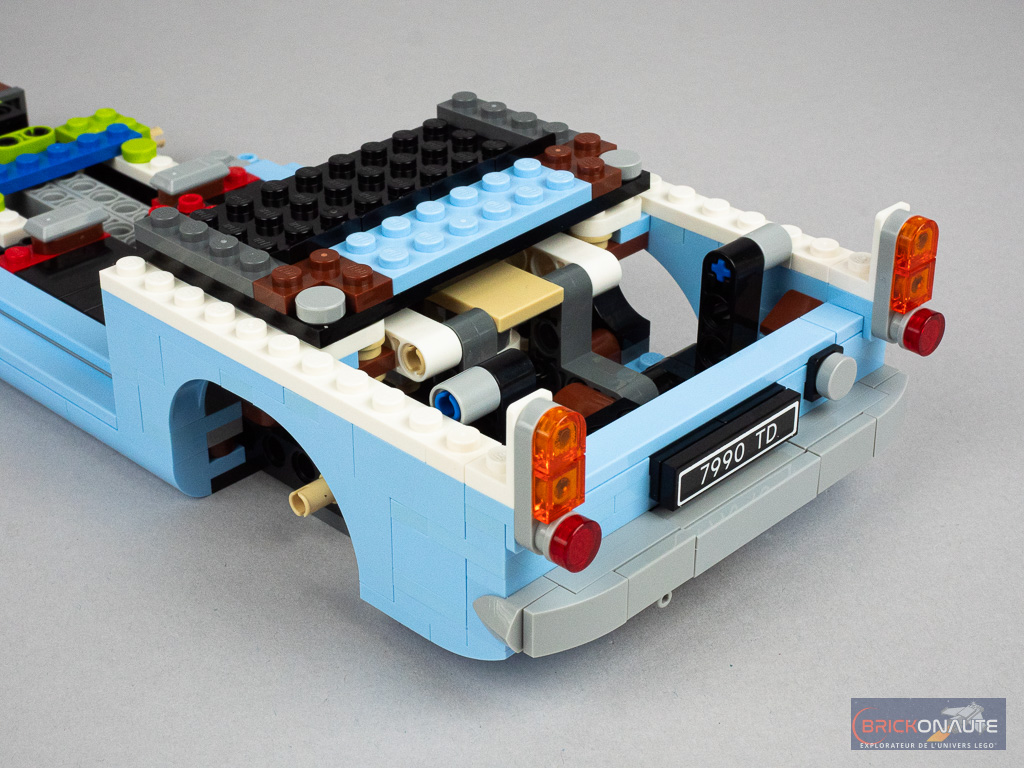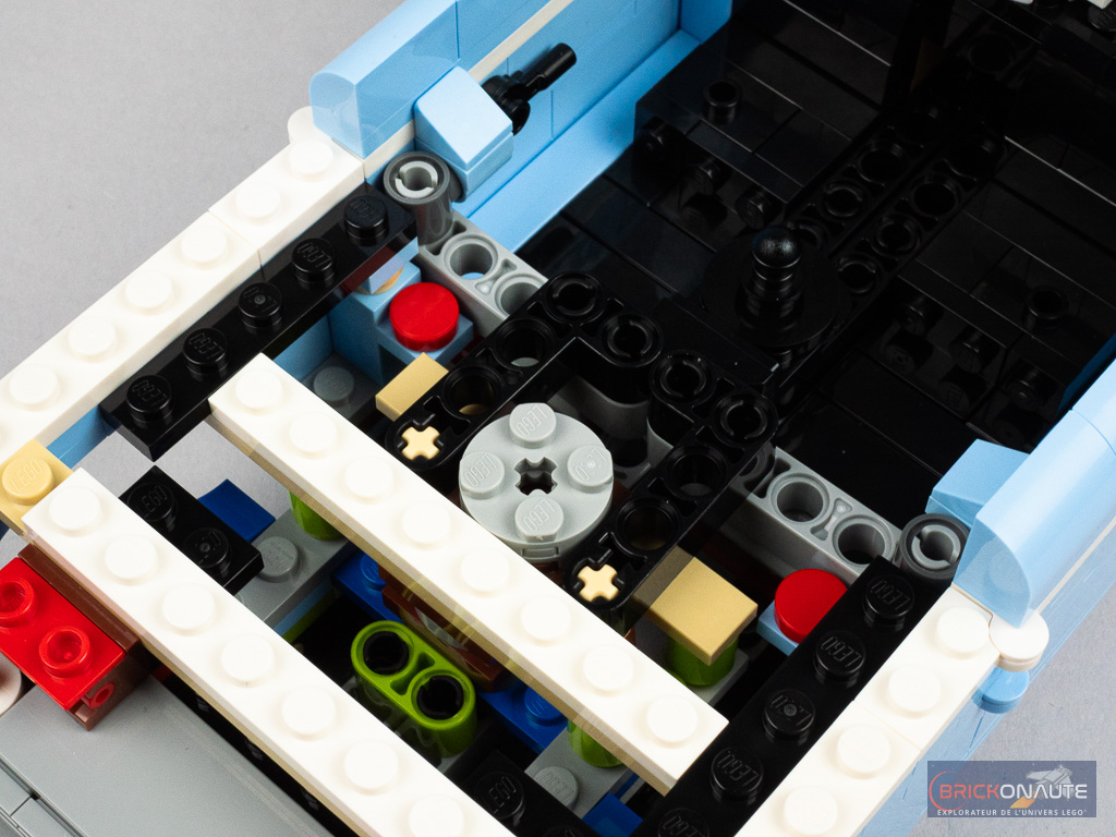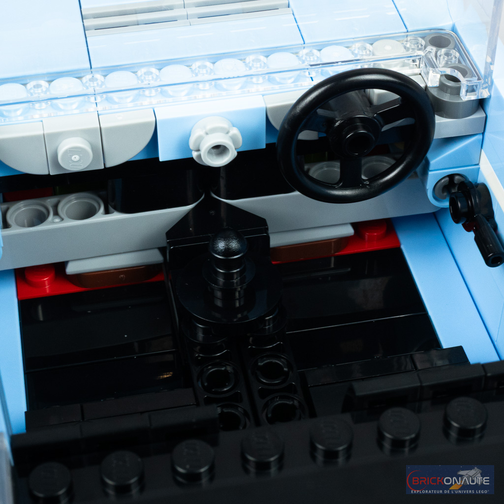 Le niveau de détail est également tout à fait satisfaisant avec un joli travail de la calandre, des optiques brick-built, des pare-chocs ou même de l’intérieur avec un tableau de bord, certes minimaliste, mais qui a le mérite d’exister. Le mécanisme dont je vous parle juste en dessous est particulièrement bien intégré et pour ainsi dire « invisible » une fois la construction terminée.