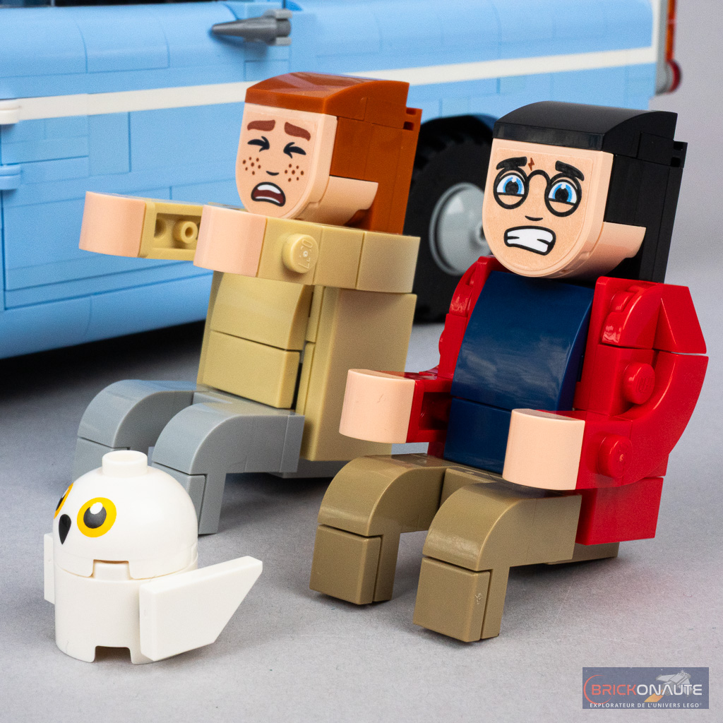 Évacuons tout de suite le sujet des personnages et donc de ces interprétations brick-built d’Harry Potter et Ron Weasley. Certains loueront peut-être le « parti pris » de ces versions plus que symboliques des héros, personnellement je n’accroche pas. Mais quitte à proposer ce genre de choses, je pense que LEGO aurait pu, a minima, tampographier les visages plutôt que d’utiliser ces autocollants aux teintes approximatives. Sans parler de leurs expressions… les photos parlent d’elles-mêmes.