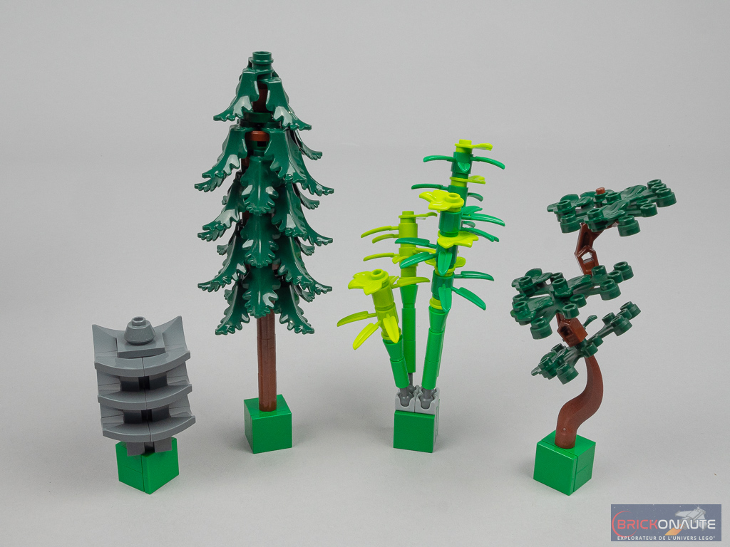 Les deux derniers sachets de pièces servent à la construction des éléments de décor principaux : deux grands cerisiers en fleurs, un cyprès, une grande lanterne ou encore quelques bambous. Dommage que les clips au pied de ces derniers soient aussi visibles avec leur couleur grise… Si la structure des cerisiers est intéressante à construire, le feuillage l’est nettement moins avec 17 sous-assemblages identiques à créer lors d’une seule et même étape (136 pièces au total !).