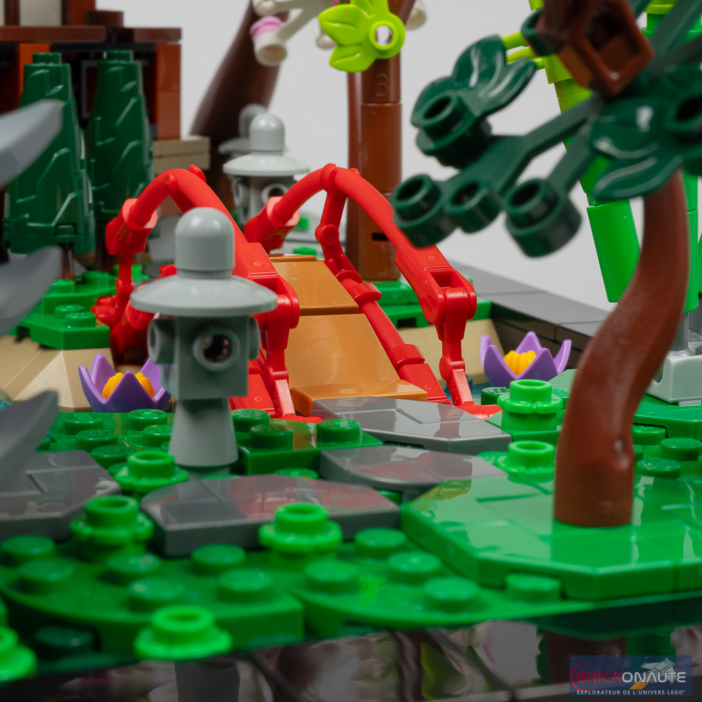 On continue ensuite l’aménagement du jardin avec des rochers, des pas japonais, des lanternes et des petits cyprès. On ajoute surtout le joli pont courbe réalisé avec des éléments flexibles et quelques robotic arms – c’est franchement joli. Remarquez aussi les marches d’accès au pavillon, réalisées avec des plateformes souvent vues dans la gamme LEGO Super Mario.