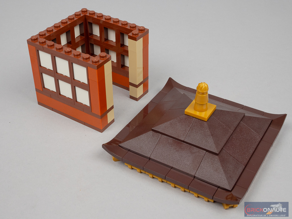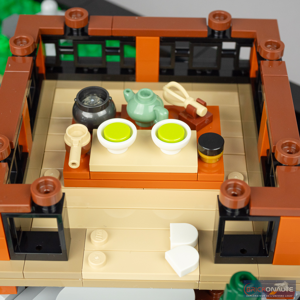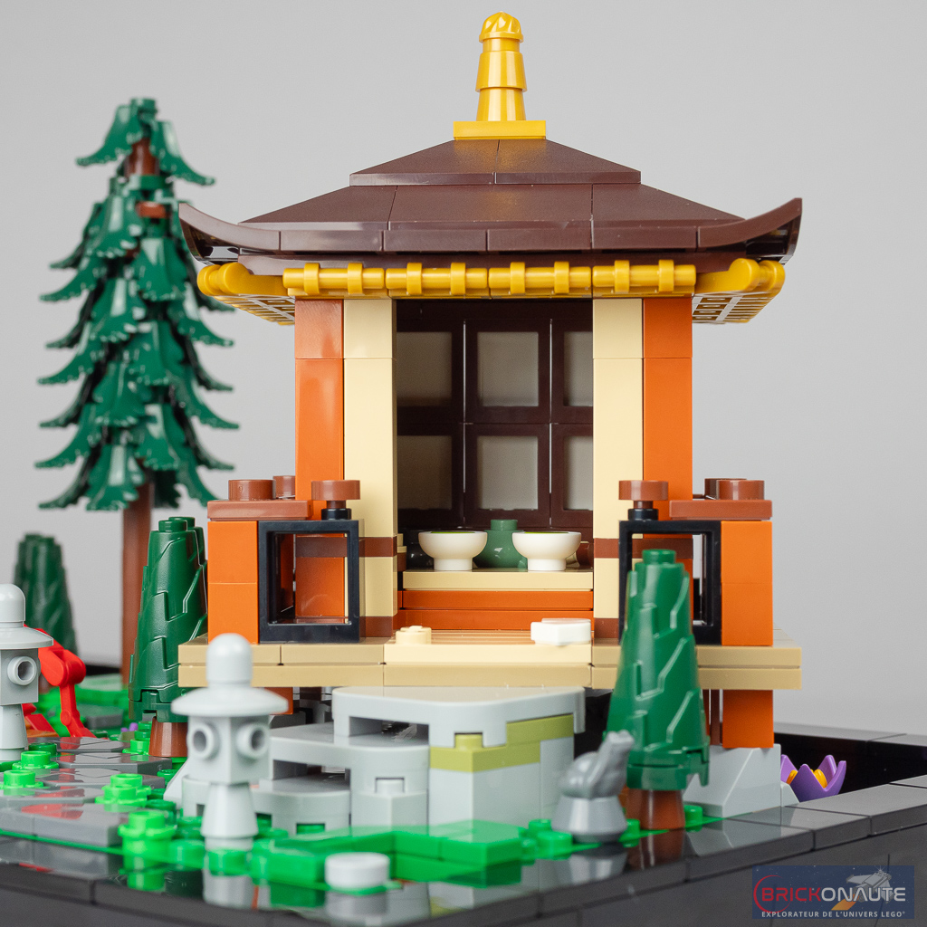 Cette boîte aurait pu être l’occasion pour LEGO de nous proposer une jolie minifig en tenue traditionnelle – il n’en est malheureusement rien. Sa présence aurait permis d’amener un peu de vie à ce jardin, en la postant sur le pont ou à l’entrée du pavillon – entrée à laquelle on retrouve justement des pantoufles qu’un japonais aurait laissées là.