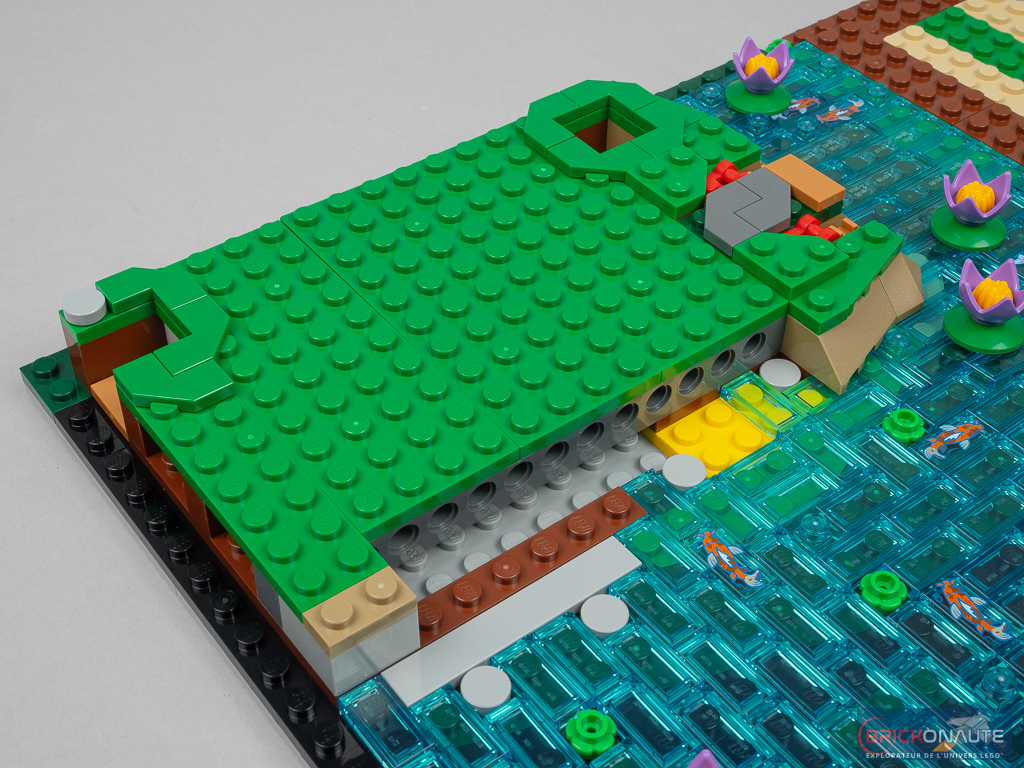 On passe ensuite au jardin à proprement parler, en commençant par une grande base de 38 x 24 tenons. On la couvre de nombreuses plates pour y former, notamment, le lit de la rivière. Une rivière qu’on construit juste après à l’aide de nombreux éléments trans light blue, dont de jolies tiles tampographiées avec des carpes Koï. On y ajoute aussi quelques fleurs de lotus.