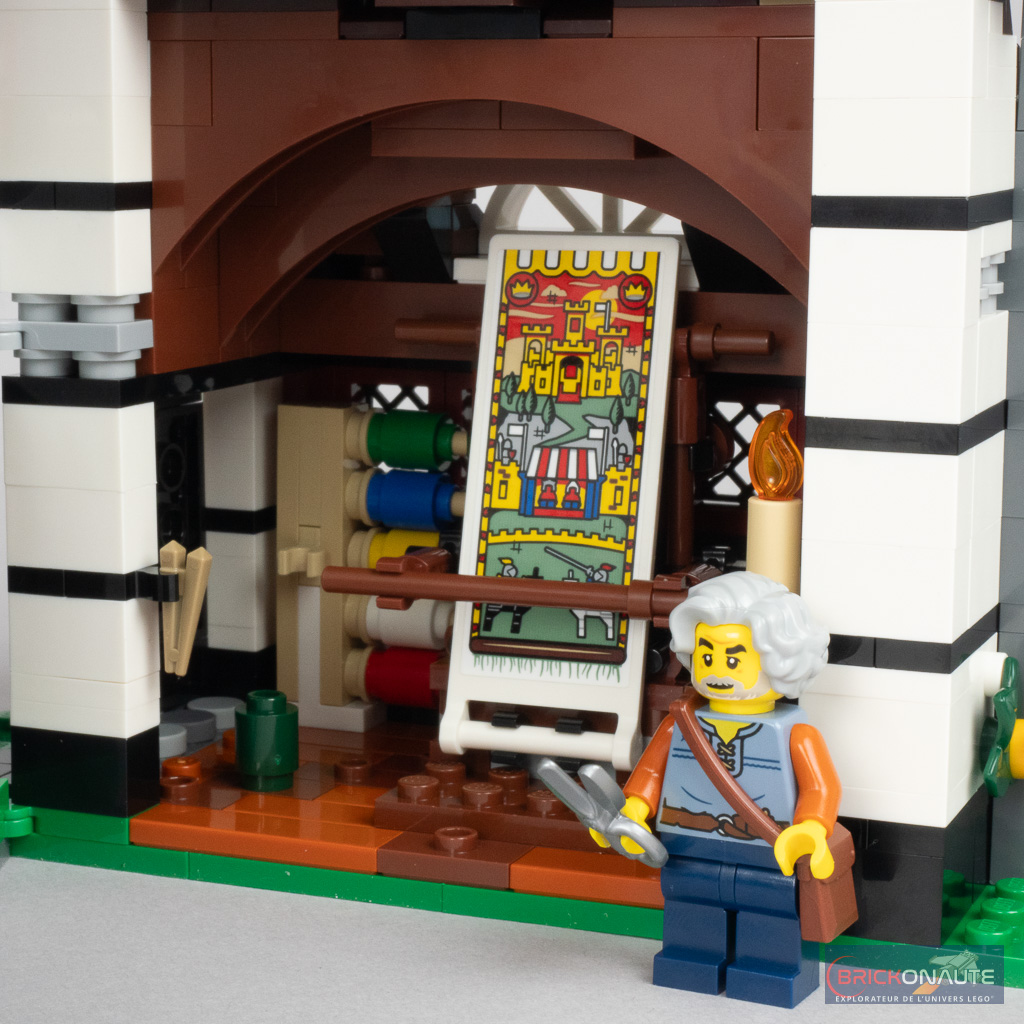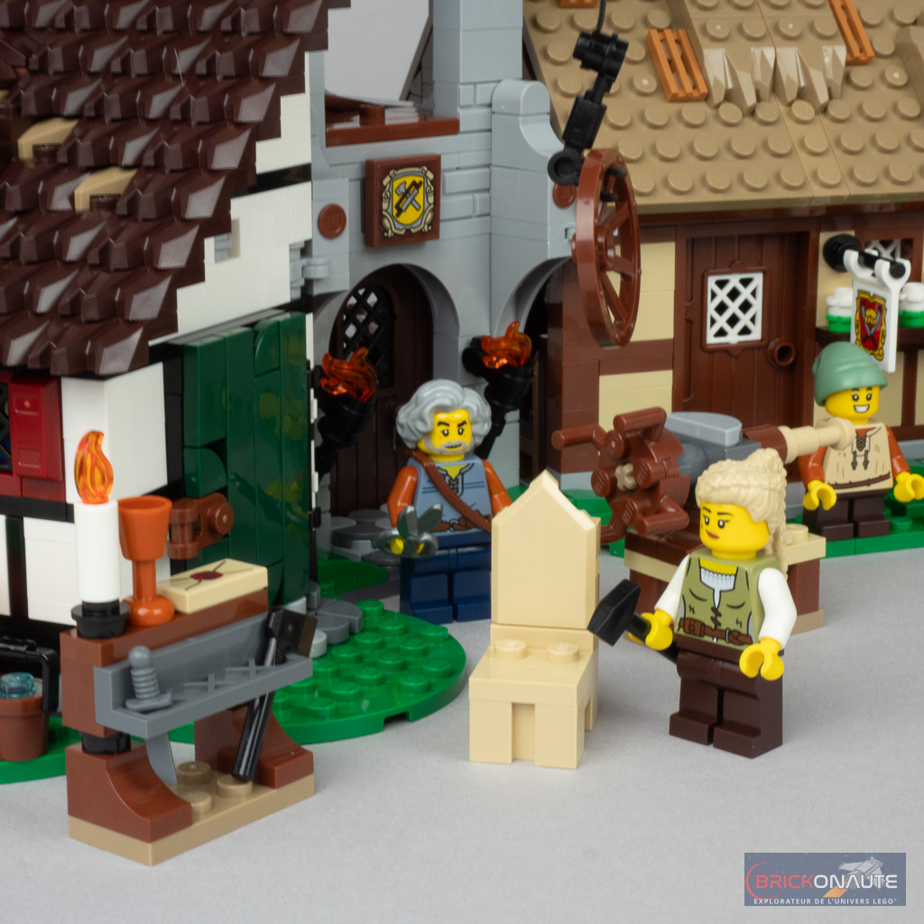 Petit détour par les minifigs avant de poursuivre cet article. Elles ne sont finalement « que » 8, et ce malgré un set de plus de 3000 pièces vendu 230 €. C’est un peu maigre à mon goût. Du côté de la réalisation, c’est en demi-teinte avec de très jolis torses dont certains sont inédits, comme la menuisière, le tisserand ou la tenancière de la taverne. Par contre, il semblerait que la machine à tampographier les pantalons devait une nouvelle fois être en panne : ils ne sont que deux à avoir ce privilège.