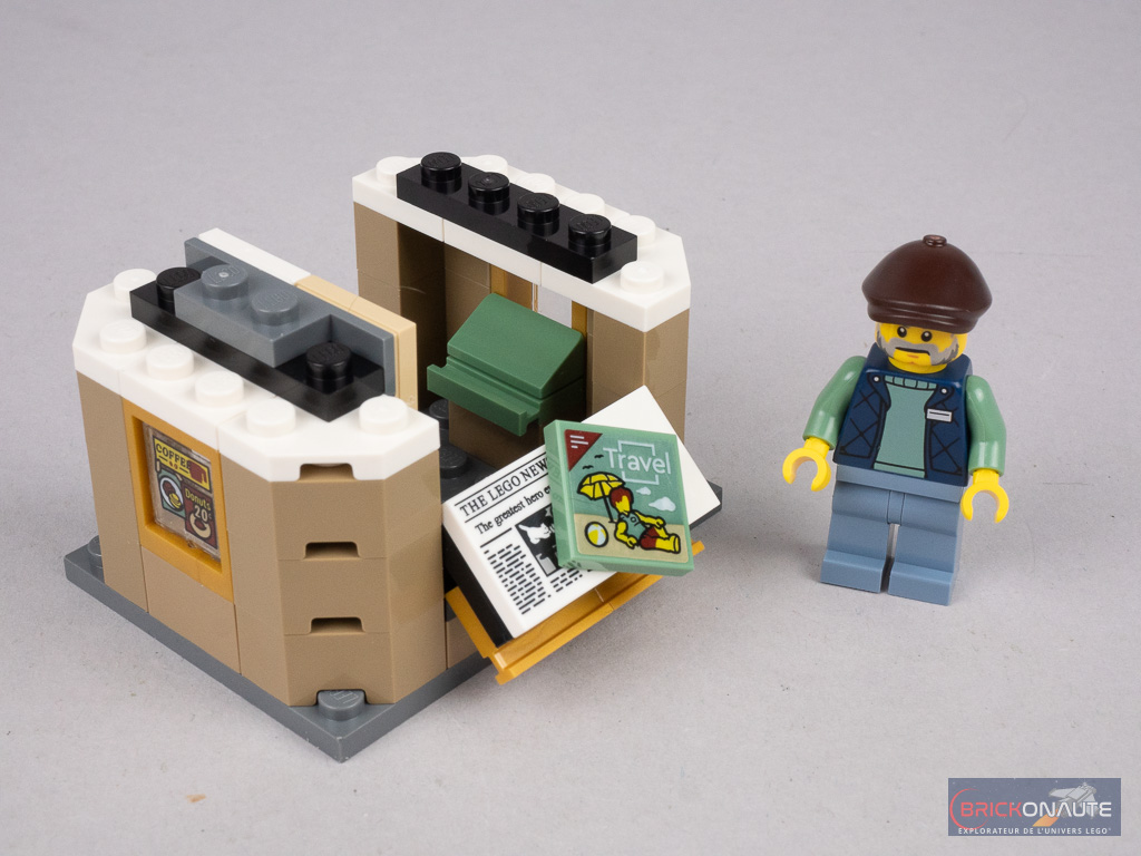 L’espace intérieur est logiquement assez réduit, mais le toit se détache facilement pour y placer la minifig du vendeur de journaux à l’intérieur. On trouve également une cliente – 2 minifigs de plus donc à ajouter au 8 déjà présentes dans la référence 10350. Elles sont assez classiques mais difficile d’en vouloir à LEGO sur ce point, c’est déjà très bien d’avoir deux personnages dans un cadeau sous conditions d’achats.