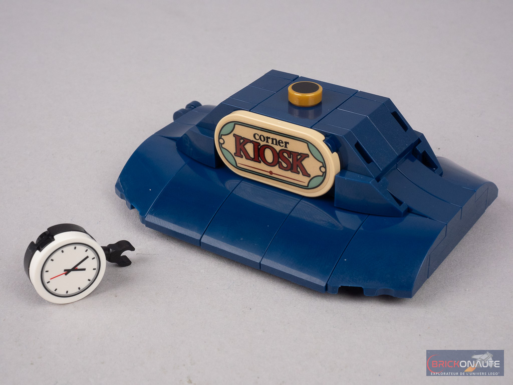 Juste un petit détail qui aurait pu faire toute la différence : ce genre de kiosques est censé se placer sur un trottoir, et lui réserver un espace dédié dans le design du set 10350 aurait été une vraie bonne idée. En l’état, il est un tout petit peu trop grand, à moins, pourquoi pas, de démonter les 3 bollards dans le coin du trottoir et de cacher l’écusson qui le décore.