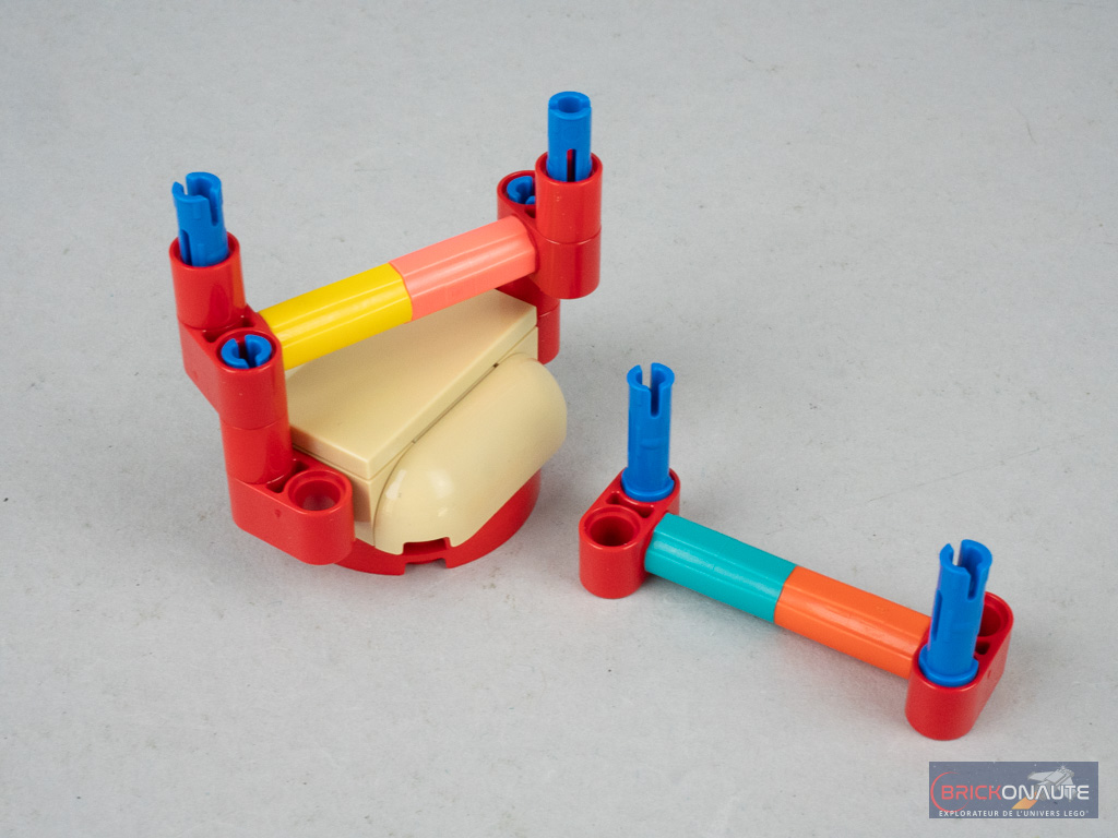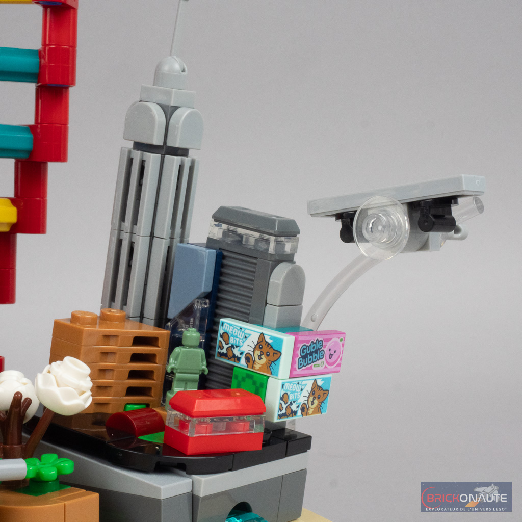 Le petit mécanisme intégré, permettant de faire tourner le brin d’ADN et de faire monter / descendre l’atome de carbone, est une bonne idée dans un set tourné vers la science. Les différentes mini-constructions sont globalement réussies, j’aime tout particulièrement la voiture et le bureau avec tous ses accessoires, jusqu’au microscope avec des tiles tampographiées de bactéries.