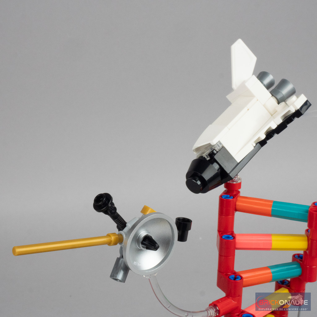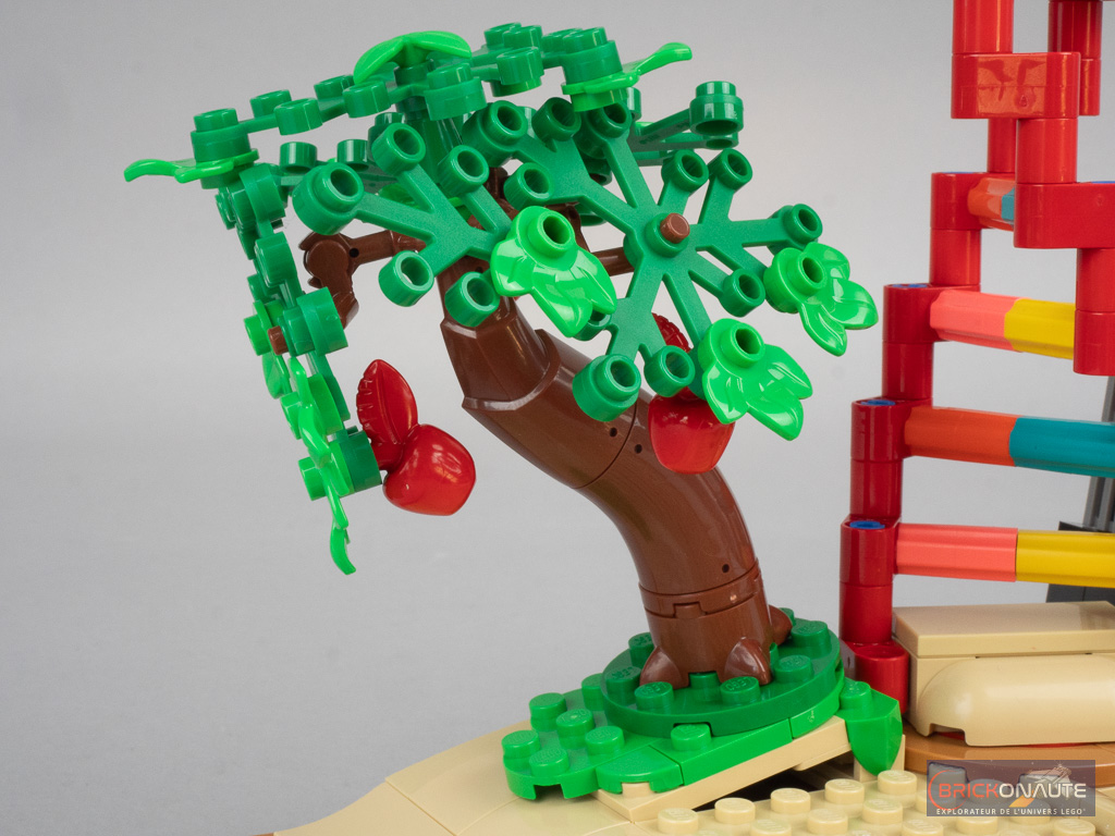 Une fois le livre construit, il s’agit essentiellement d’enchaîner les micro-constructions avec un pommier (pour Newton et la célèbre légende), une voiture, une jardinière, un morceau de ville avec un avion, un bras robotique, un bureau avec un ordinateur et d’autres outils scientifiques, la sonde Voyager, la navette spatiale ou même une abeille. Le brin d’ADN utilise de nouvelles pièces Technic, des petits beams avec une amorce d’axe sur le côté, pour obtenir le décalage nécessaire à la création de la double-hélice. L’atome de carbone utilise pour sa part des petites couronnes pour y attacher les protons / neutrons, ainsi qu’une grande couronne et une tige souple pour les couches d’électrons.
