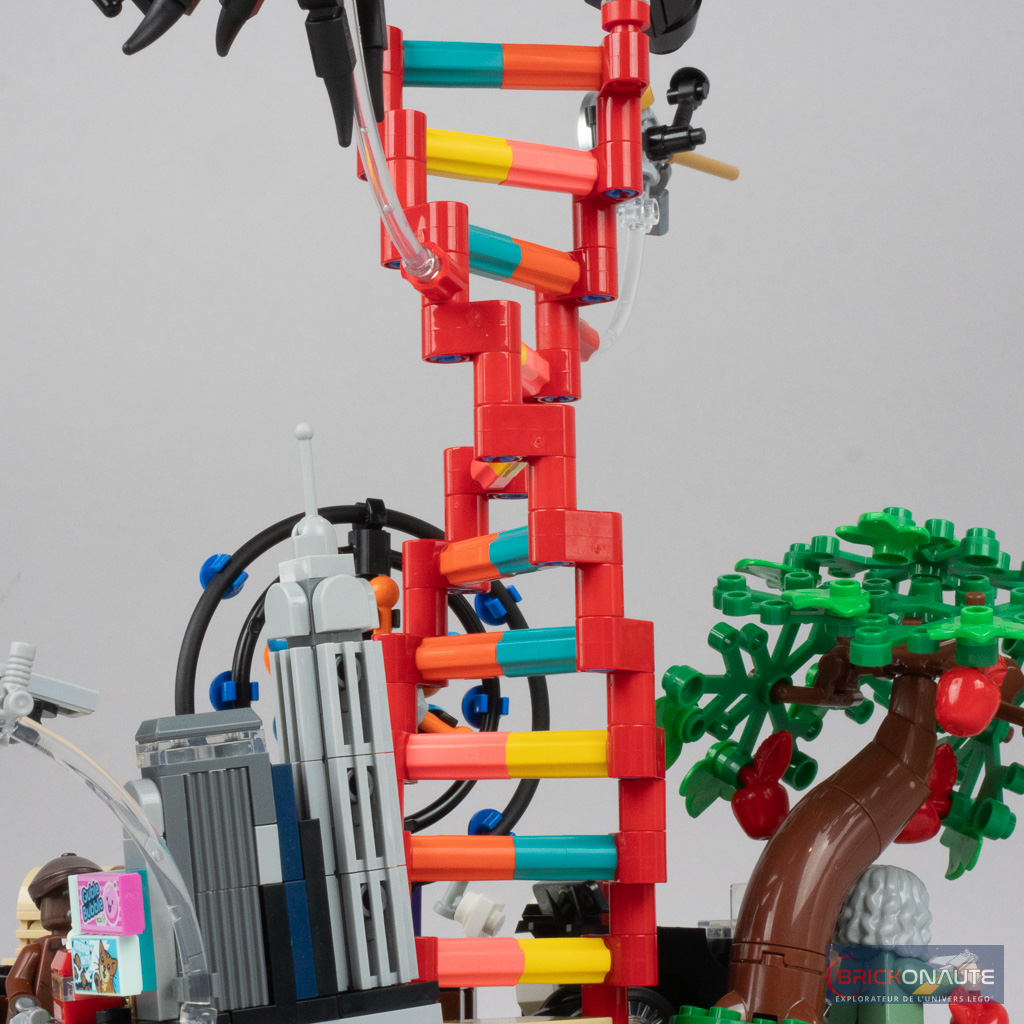 On se plaint souvent de « l’adaptation » faite par LEGO des projets originaux publiés sur la plateforme LEGO Ideas. Mais pour une fois, difficile de se lamenter : la proposition est clairement plus variée, plus colorée et disons-le, plus ambitieuse que le projet original – dont on ne retrouve finalement que l’idée de base : les innovations scientifiques qui « germent » depuis les pages d’un livre.