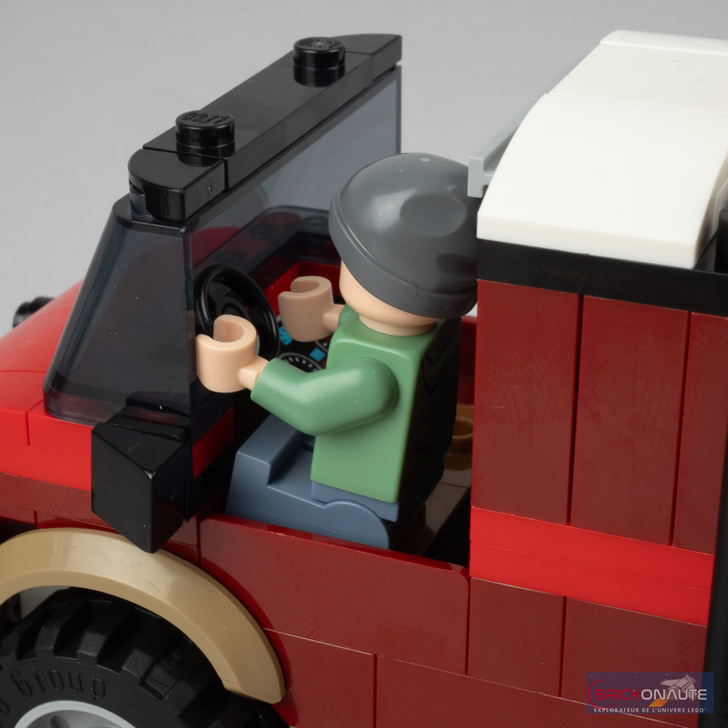 On pourra retirer le toit de la cabine pour dévoiler un intérieur sommaire, où deux minifigs pourront prendre place. À l’arrière, un crochet d’attelage permet de fixer une remorque qui comporte quelques outils scientifiques avec un microscope, une antenne radar et un écran de contrôle. Ces éléments sont prévus pour être facilement détachables – là encore pour facilité les mises en scène.