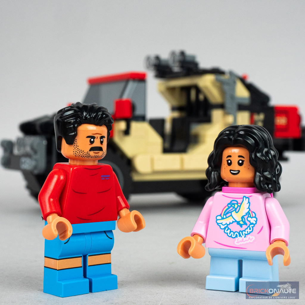 Deux minifigs sont fournies dans cette boîte avec Reuben Delgado et sa fille Isabella. La tenue du premier est très simple mais on appréciera malgré tout la tampographie des jambes. Quant à la seconde, elle porte un joli haut coloré avec un petit sac à dos. Les autres stars de cette boîte ce sont évidemment les dinos avec un raptor « petite version » (sans pattes articulées – tel qu’on peut le trouver également dans le set 76973 Raptor & Titanosaurus Tracking Mission) et le bébé aquilops « Dolores » qui bénéficie pour l’occasion d’un tout nouveau moule.