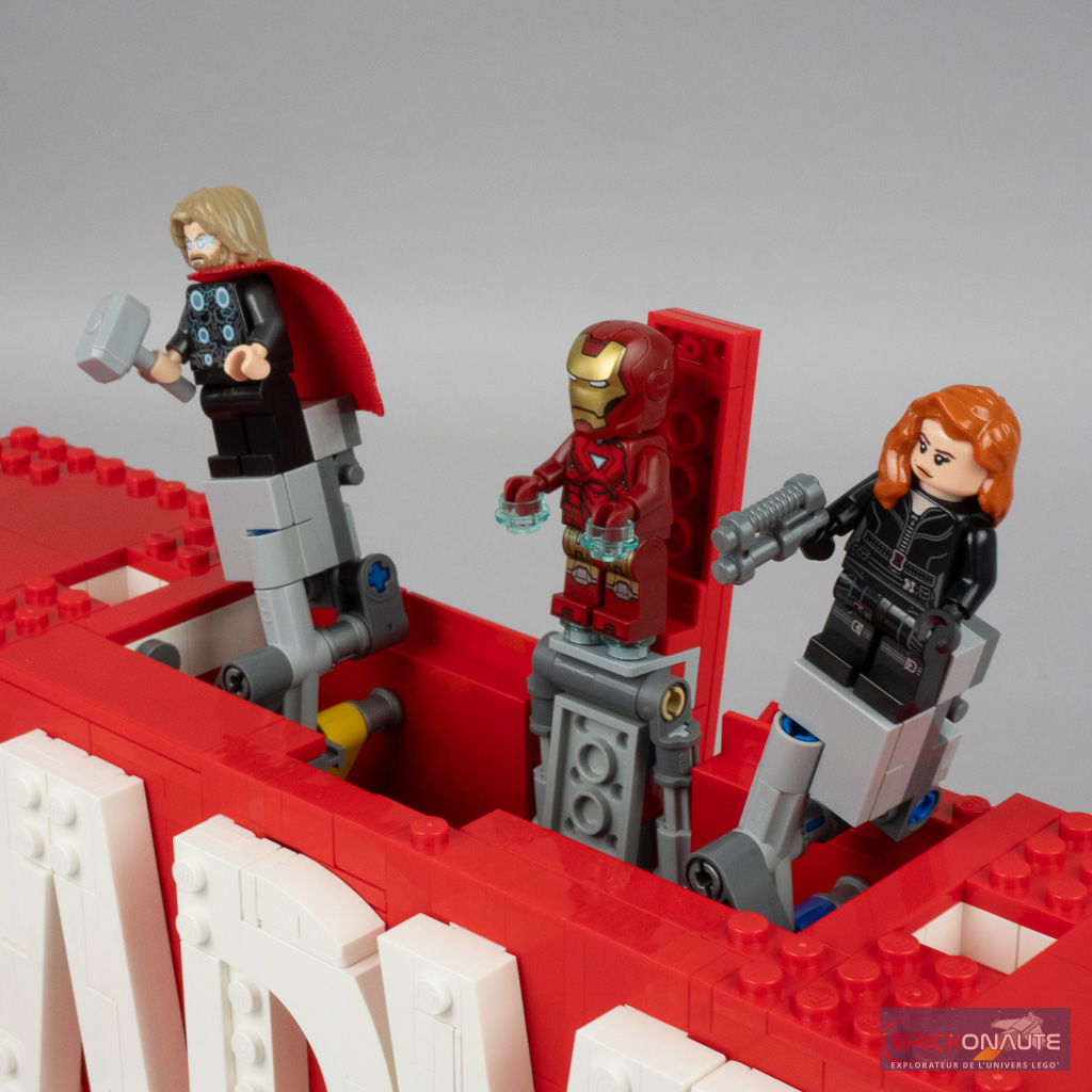 LEGO semble décidé à nous proposer des sets de logos célèbres – à en juger par la sortie récente également du set LEGO Star Wars 75407 Brick-Built Star Wars Logo (mon test à cette adresse) mais la proposition est ici radicalement différente. On se retrouve, à la fin de l’assemblage, avec un gros pavé rouge avec l’inscription MARVEL, plutôt fidèle en termes de proportions au célèbre logo – y compris dans la réalisation des écritures. Le mélange tenons visibles et faces lisses me paraît bien équilibré, et le mécanisme est invisible une fois l’ensemble refermé.