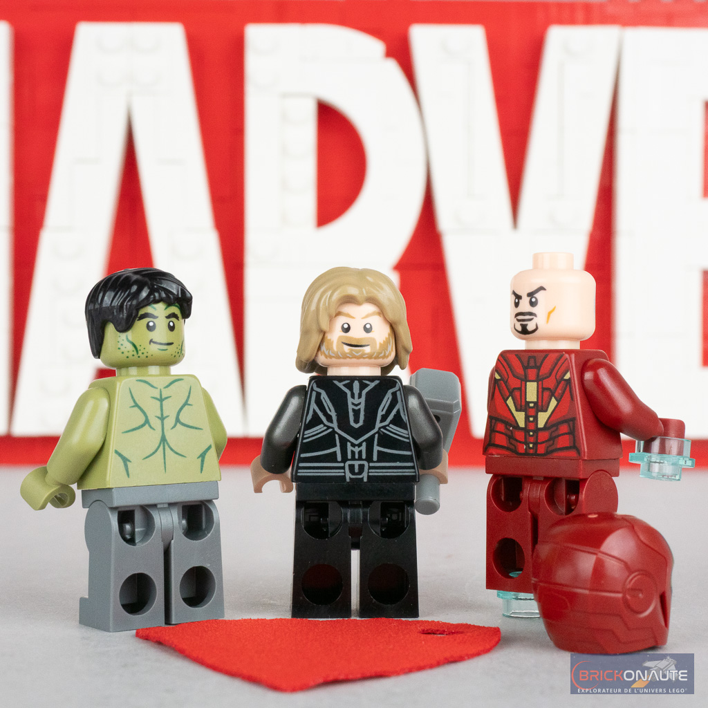Les jambes des 3 autres personnages sont malheureusement monochromes. On trouve Hulk en version minifig – et je dois avouer que ce format ne lui sied pas vraiment mais bon, il fallait réussir à le faire rentrer dans la boîte. Captain America est pour sa part proposé dans une version First Avenger plutôt bien exécutée, avec son habituel bouclier. Et pour terminer, on trouve également Thor avec une petite cape en tissu et un nouveau torse également très bien réalisé. Tous les personnages bénéficient d’une expression alternative pour le visage.