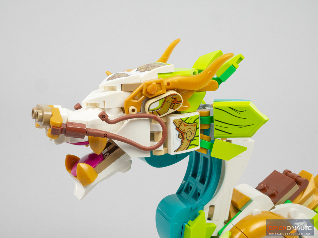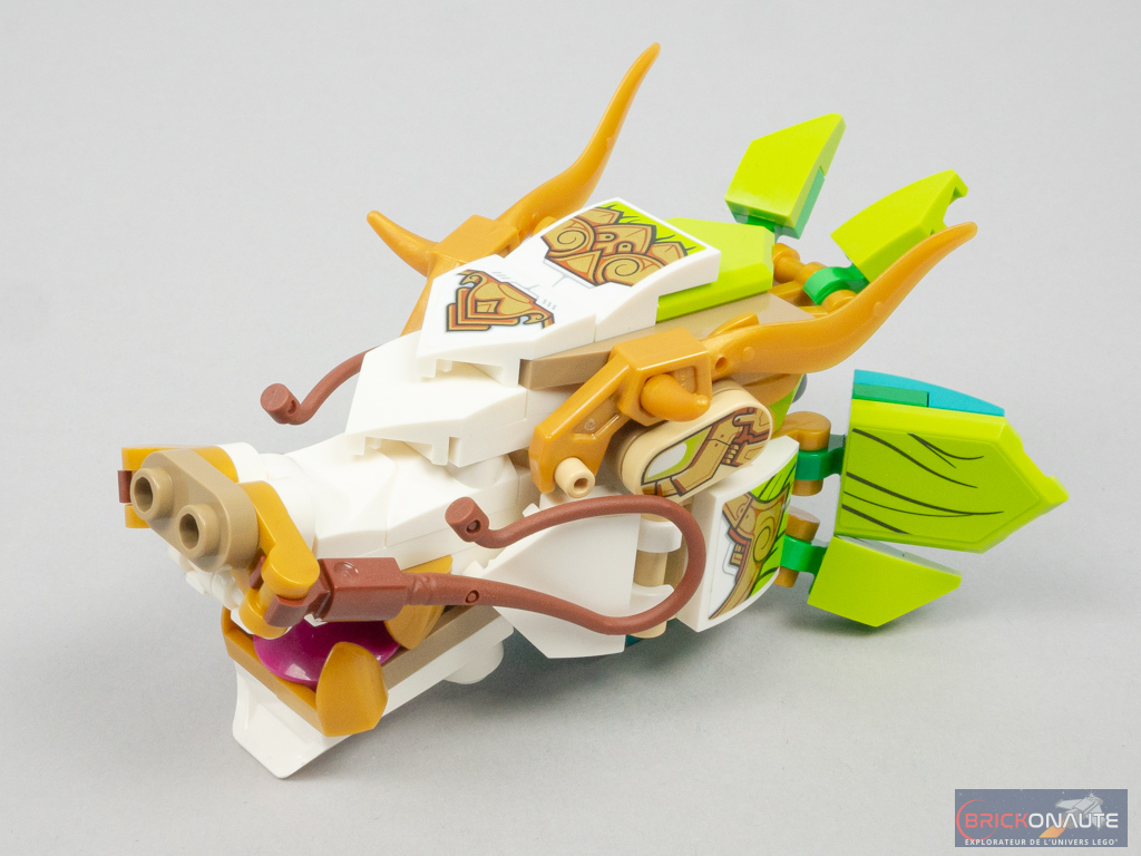 J’aime également beaucoup le choix de couleurs retenu : le mélange blanc / teal / bright yellowish green / or fonctionne particulièrement bien. Deux stud shooters sont judicieusement intégrés au niveau des flancs dorés et apportent un degré de jouabilité supplémentaire bienvenu. Le niveau de détail est très satisfaisant – je vous laisse regarder les photos pour vous faire une idée – mais le revers de la médaille c’est que l’ensemble peut s’avérer un peu fragile lorsqu’on le manipule. Les petites écailles vertes auront ainsi tendance à se détacher facilement.
