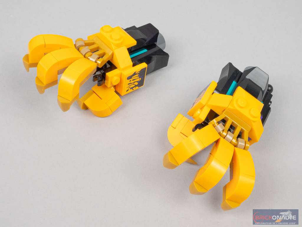 Le processus d’assemblage est très similaire aux autres gros robots présents dans les différentes gammes LEGO. On commence par assembler le torse et sa structure à base d’éléments Technic, sur laquelle on vient rapporter au fur et à mesure les différents éléments : hanches et cuisses, mollets, pieds, épaule et bras, avant-bras et mains, avant de finir par la tête. Le dernier sachet de pièces permet de construire les accessoires – une sorte de « bazooka-mitrailleur » (à fixer sur les épaules ou dans le dos de la bestiole) et une épée.