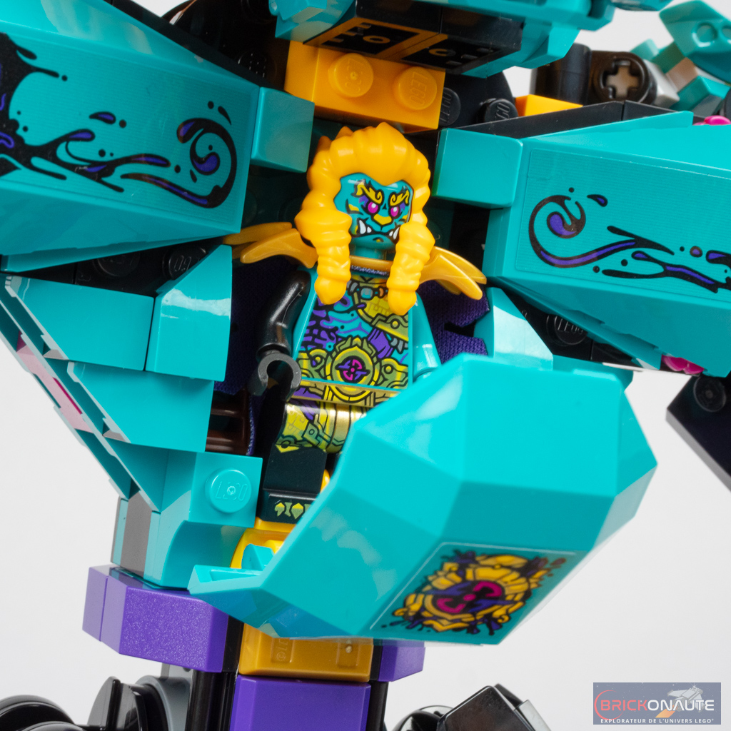 Le look de ce robot est vraiment cool et correspond bien à l’idée qu’on se ferait du mech piloté par le méchant de service. Son aspect général et ses proportions le rapprochent d’ailleurs bien plus d’un animal géant que d’un robot. Le choix des couleurs est également très bon avec un joli mélange de teal, de flame yellowish orange, de noir et d’éléments dorés. Et cette crinière est sublime – elle fait appel à un élément (en 3 exemplaires) traditionnellement employé pour la mâchoire des dragons, inédit dans cette couleur.
